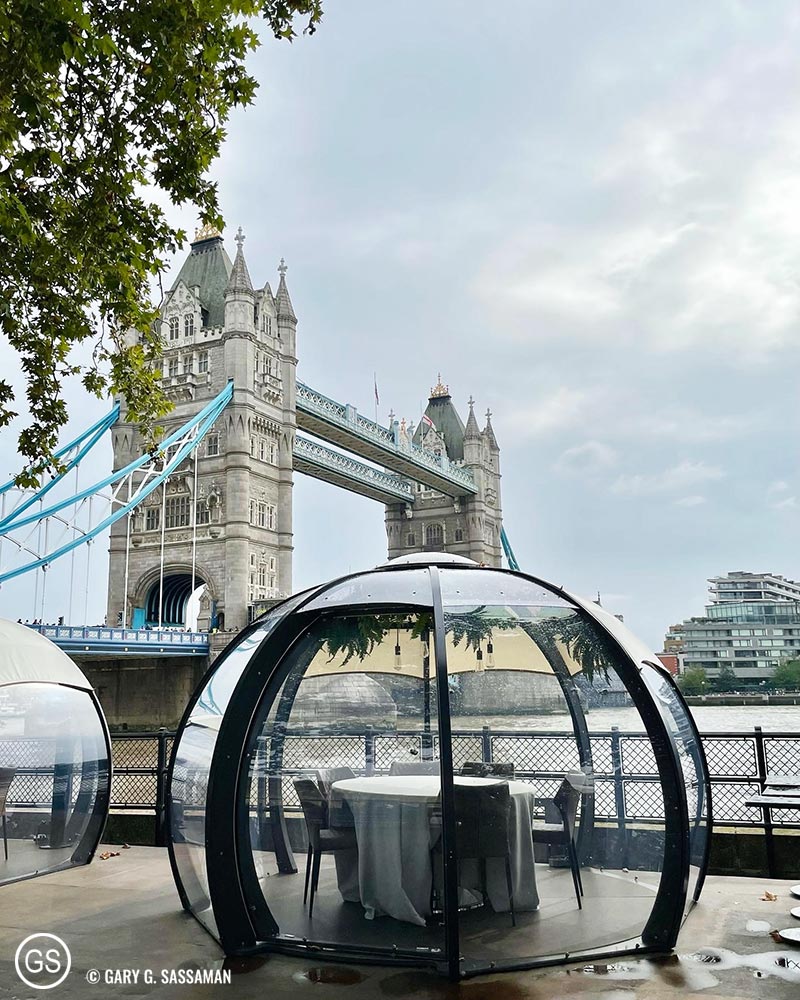 Top row: Leadenhall Market, Somerset House, and a view of The Shard from Tower Bridge; bottom row: Tower Bridge with one of the dining pods near the Tower of London, and St. Paul’s Cathedral.