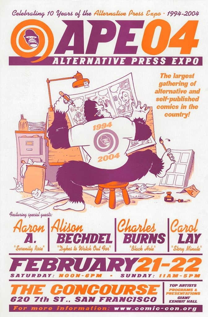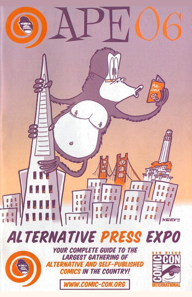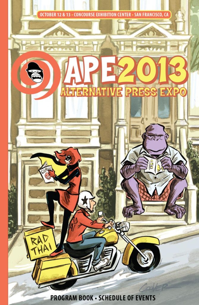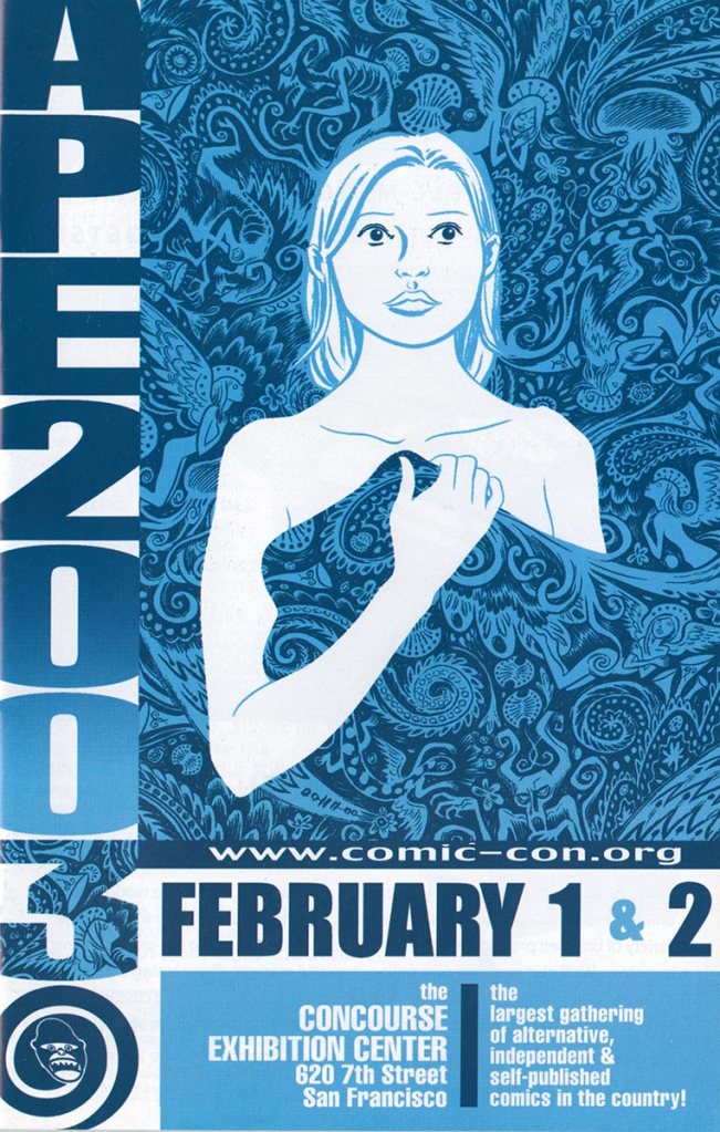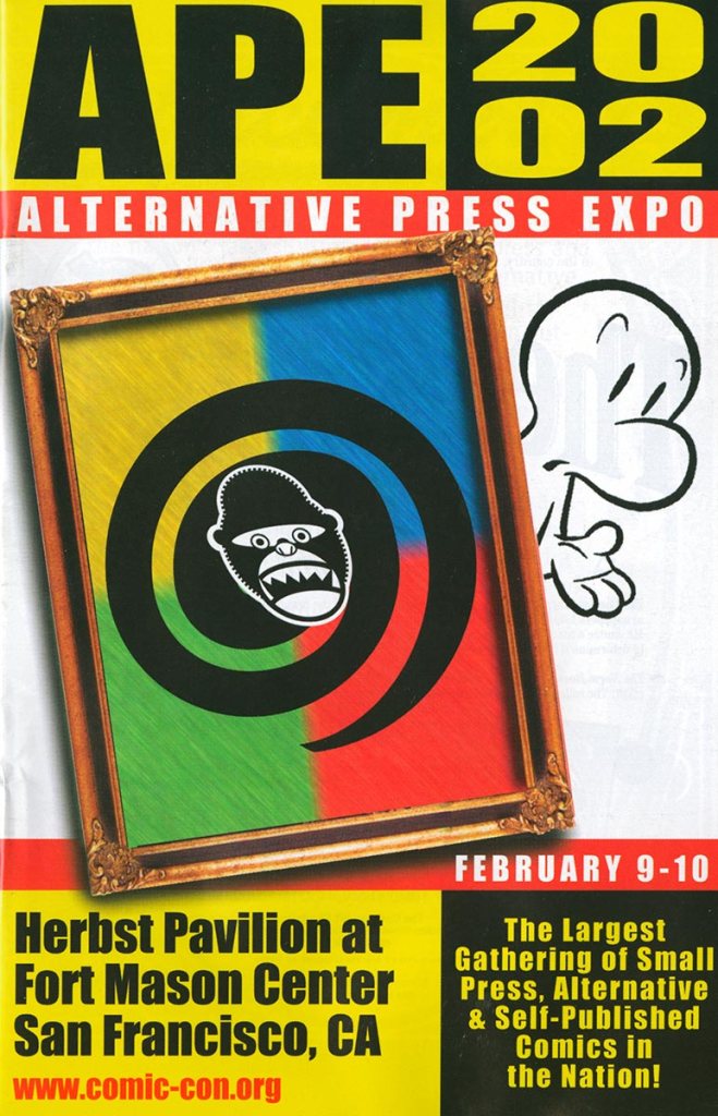 APE was short for the Alternative Press Expo, a bit of a misnomer in that it sounded more like a gathering of weekly city newspapers and less about comics, but it was the name we inherited from the show’s founder, Dan Vado of SLG Publishing (SLG=Slave Labor Graphics, not exactly politically correct then or now). I have a fondness for the show due to a number of things. It was about small press, independent, and yes, alternative comics, although towards the end a bit of DIY craft stuff started to creep into the show. It was held in San Francisco (originally San Jose), back when that city was a joy to visit. And it was a “boots-on-the-ground” type of show, meaning that the small staff that went up for the APE weekend would get up at the crack of dawn on Saturday and go to the venue to set up rented tables and chairs, and then tear it all down at the end of the day on Sunday. It was a bit grueling at times, but always fun. And most importantly, the exhibitors at APE were mainly comics publishers, some large (Fantagraphics, Drawn & Quarterly, SLG), and some decidedly of the mom-and-pop (or just mom or just pop) variety. The array of creativity was staggering at times and always inspirational. You couldn’t roam the APE Exhibit Hall without encountering some kind of amazing comic book or print or piece of art that you just had to have.