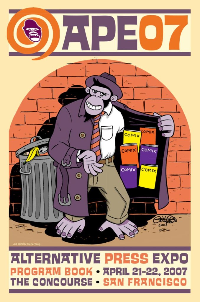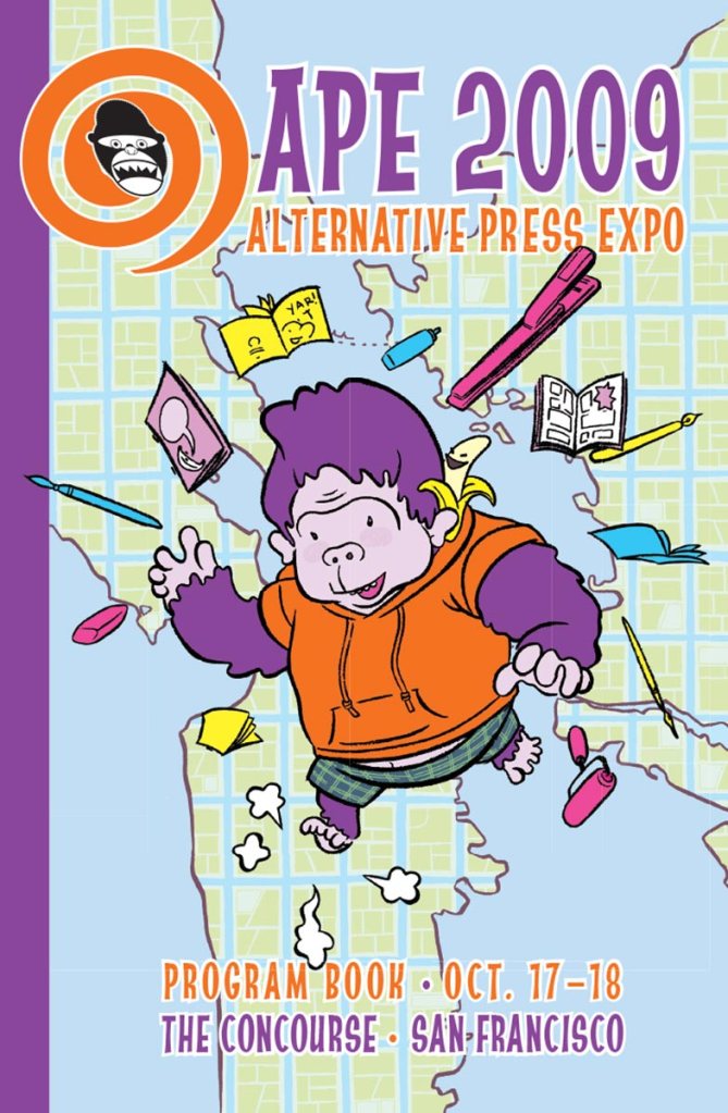 When I took over as Director of Print and Publications in 2007, in addition to the APE Program Book that I edited and designed, I also designed all the ancillary promotional items we did, including posters, postcards, flyers, bookmarks, and local Bay Area newspaper ads. That art was always a variation of the cover art for the Program Book, and I had the opportunity to work with some great artists. We started doing original covers with the 2004 book (by the late Batton Lash, who also did the 2005 cover). It was always a great deal of fun to work with the artists on these and if I had to pick my favorite, I’d say it has to be Paige Braddock’s ape cartoonist for 2008, which—if memory serves me right—I also colored from Paige’s original line art drawing. I just love that drawing and the layout on that particular cover lent itself to the poster we sent to Bay Area comics shops and the newspaper ads I designed.
