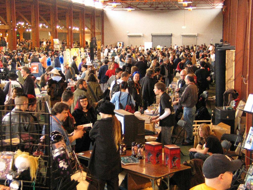 The APE venue for many of those years (2003-2013) contributed to that funky feeling, too. It was called the Concourse Exhibition Center, and supposedly it was an old train station. You could see the center of the building was the tracks and the two upper levels that flanked it were platforms. For the first few years, APE was only in one half of the building (for a while the west side, then just the east side), which meant there was space for only one programming room, carved out of the Exhibit Hall and curtained off. Later, when APE took the whole Concourse building, an additional workshop room was added on the mezzanine over the east side of the building.