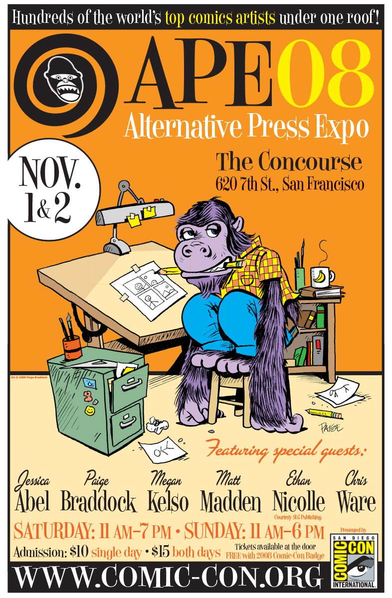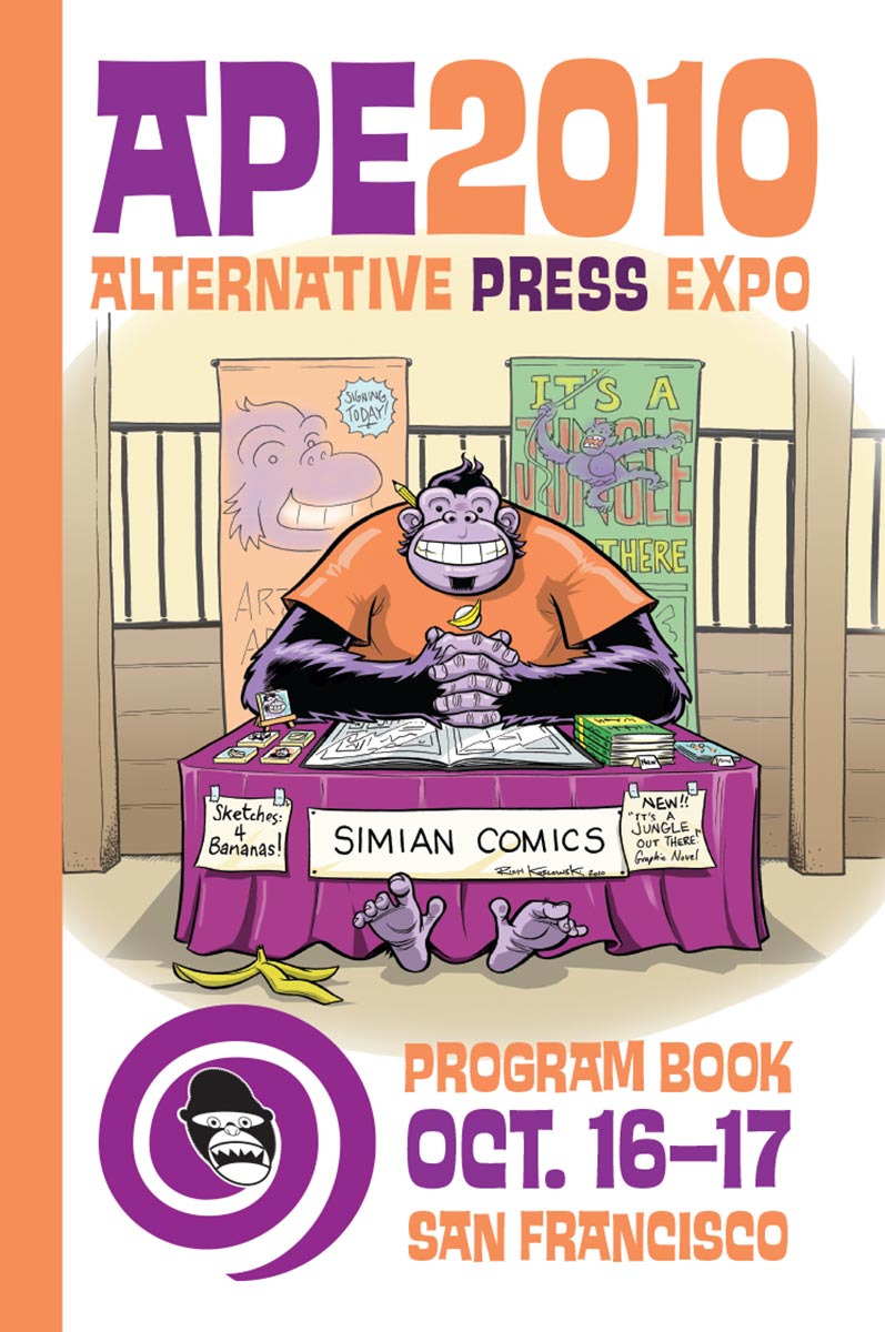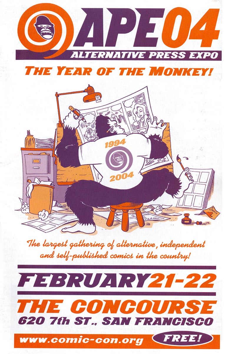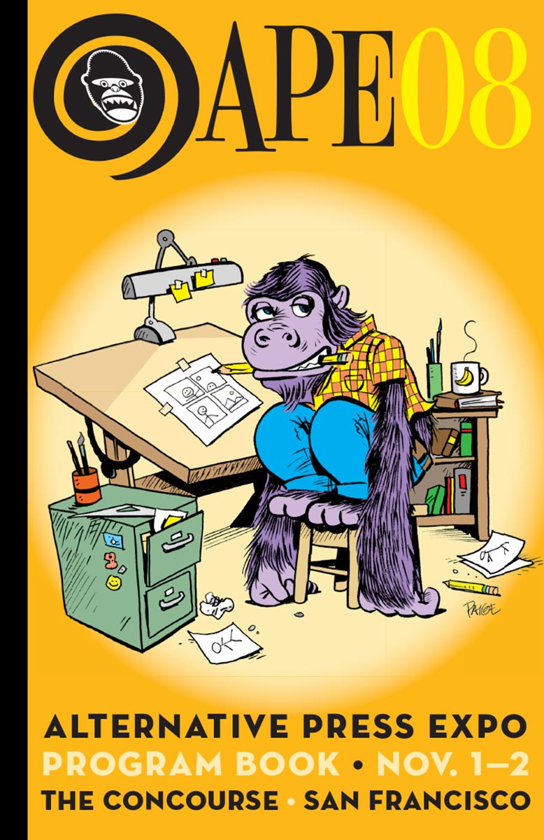 When I took over as Director of Print and Publications in 2007, in addition to the APE Program Book that I edited and designed, I also designed all the ancillary promotional items we did, including posters, postcards, flyers, bookmarks, and local Bay Area newspaper ads. That art was always a variation of the cover art for the Program Book, and I had the opportunity to work with some great artists. We started doing original covers with the 2004 book (by the late Batton Lash, who also did the 2005 cover). It was always a great deal of fun to work with the artists on these and if I had to pick my favorite, I’d say it has to be Paige Braddock’s ape cartoonist for 2008, which—if memory serves me right—I also colored from Paige’s original line art drawing. I just love that drawing and the layout on that particular cover lent itself to the poster we sent to Bay Area comics shops and the newspaper ads I designed.