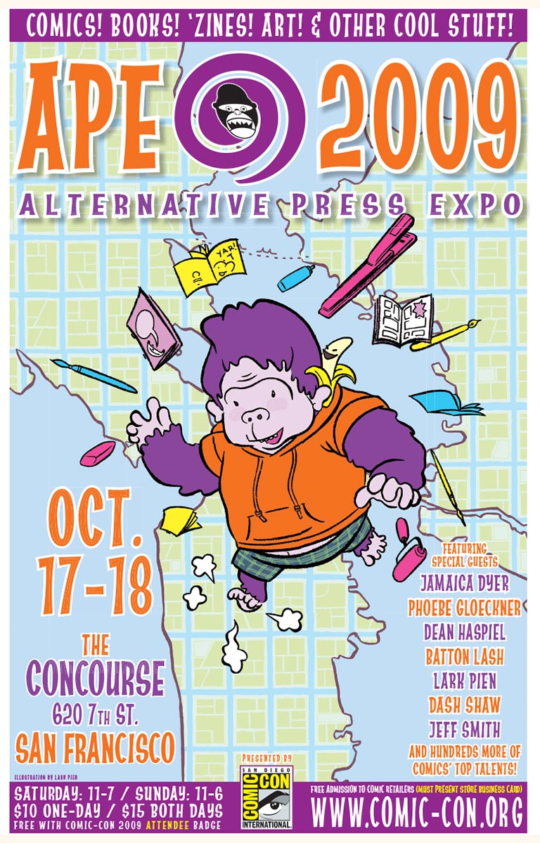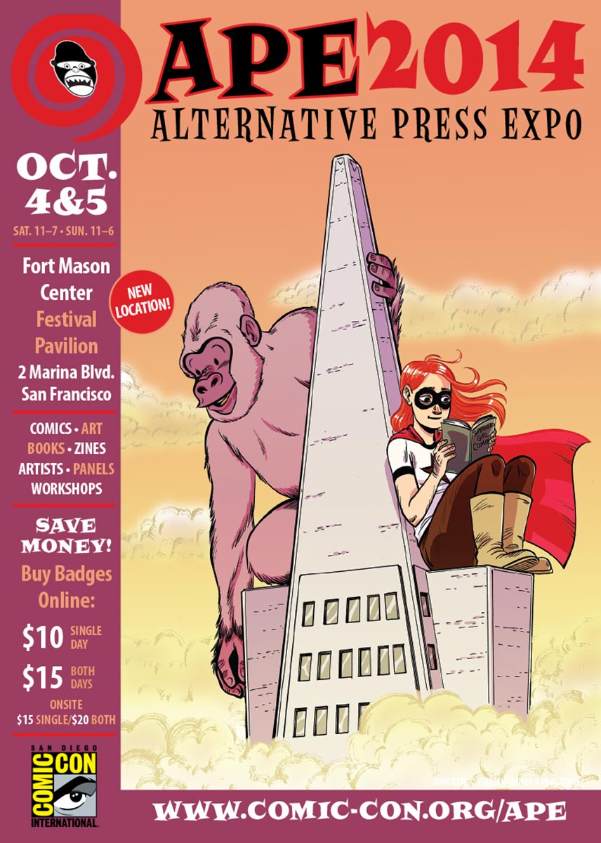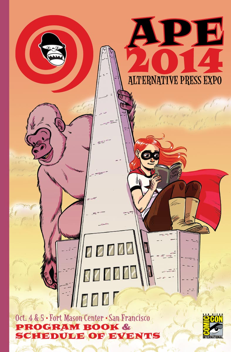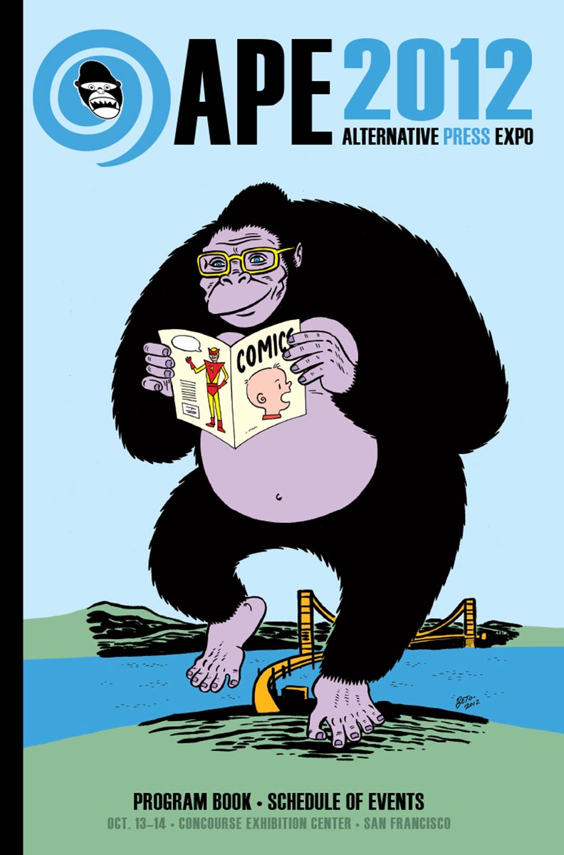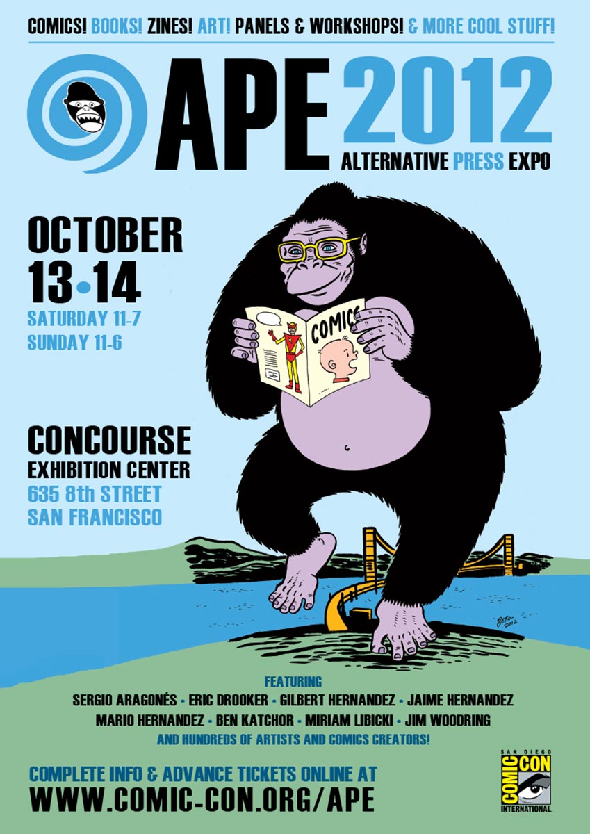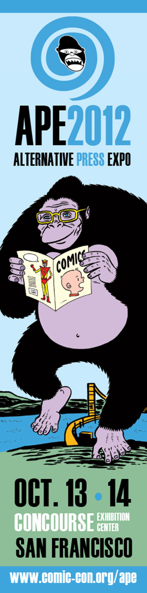 APE was short for the Alternative Press Expo, a bit of a misnomer in that it sounded more like a gathering of weekly city newspapers and less about comics, but it was the name we inherited from the show’s founder, Dan Vado of SLG Publishing (SLG=Slave Labor Graphics, not exactly politically correct then or now). I have a fondness for the show due to a number of things. It was about small press, independent, and yes, alternative comics, although towards the end a bit of DIY craft stuff started to creep into the show. It was held in San Francisco (originally San Jose), back when that city was a joy to visit. And it was a “boots-on-the-ground” type of show, meaning that the small staff that went up for the APE weekend would get up at the crack of dawn on Saturday and go to the venue to set up rented tables and chairs, and then tear it all down at the end of the day on Sunday. It was a bit grueling at times, but always fun. And most importantly, the exhibitors at APE were mainly comics publishers, some large (Fantagraphics, Drawn & Quarterly, SLG), and some decidedly of the mom-and-pop (or just mom or just pop) variety. The array of creativity was staggering at times and always inspirational. You couldn’t roam the APE Exhibit Hall without encountering some kind of amazing comic book or print or piece of art that you just had to have.