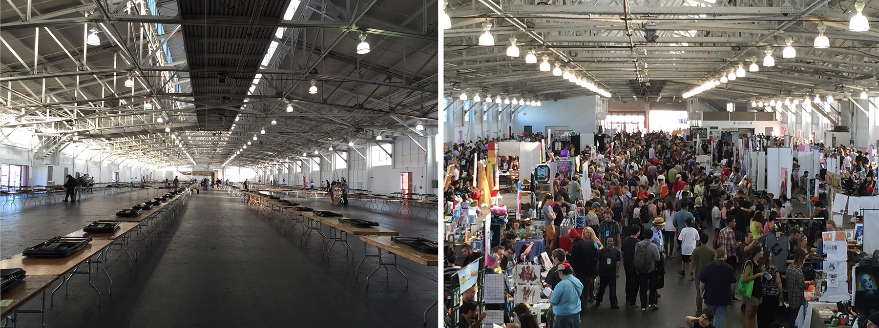 Before (empty hall at left) and after during the last year for APE run by Comic-Con at the Festival Pavilion at Fort Mason Center. While it was a fun and busy show, knowing that it was the final SDCC-run show made it more than a bit sad. Good-bye San Francisco … by this point WonderCon had already moved to Anaheim. Photos by me.