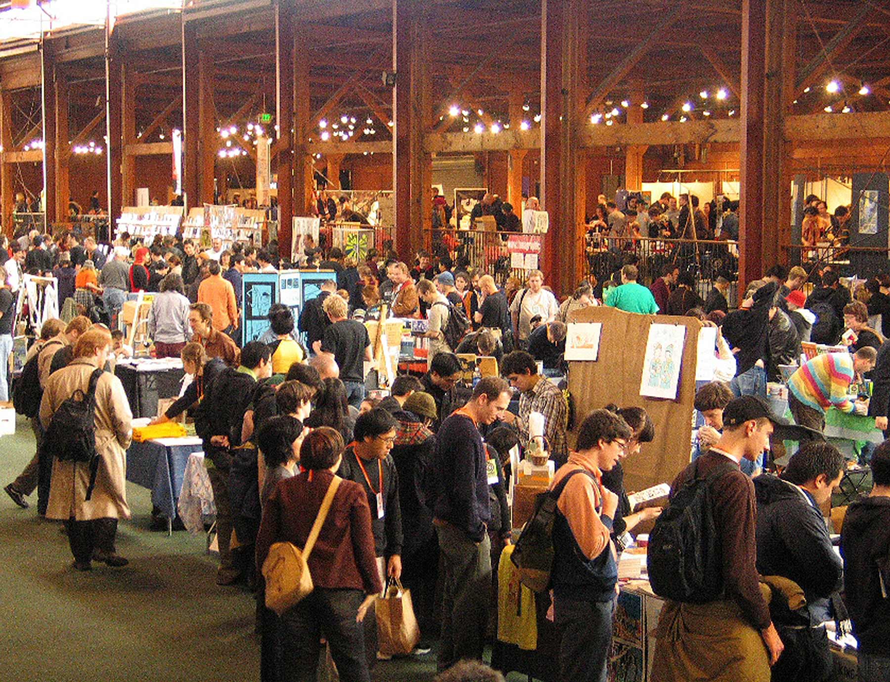 The APE venue for many of those years (2003-2013) contributed to that funky feeling, too. It was called the Concourse Exhibition Center, and supposedly it was an old train station. You could see the center of the building was the tracks and the two upper levels that flanked it were platforms. For the first few years, APE was only in one half of the building (for a while the west side, then just the east side), which meant there was space for only one programming room, carved out of the Exhibit Hall and curtained off. Later, when APE took the whole Concourse building, an additional workshop room was added on the mezzanine over the east side of the building.