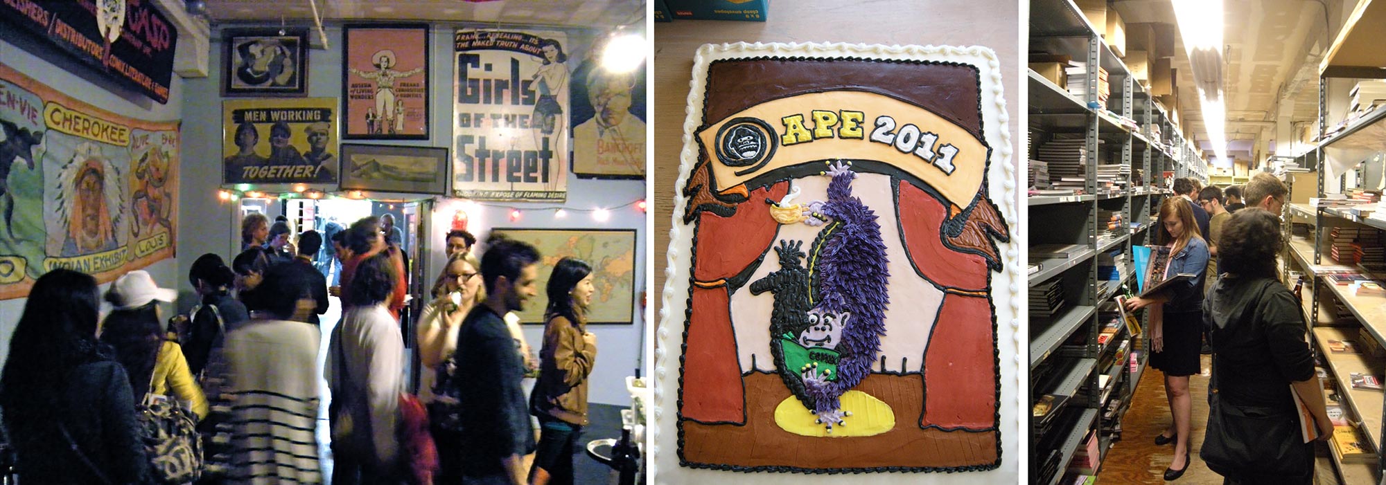 The exhibitor registration party held at the Last Gasp warehouse in San Francisco was always a highlight of APE for me. Ron Turner’s incredible collection of circus banners was on display and it was wonderful to be able to explore row upon row of incredible books (and purchase them at a discount). The APE cake (center) was a fun addition, too.