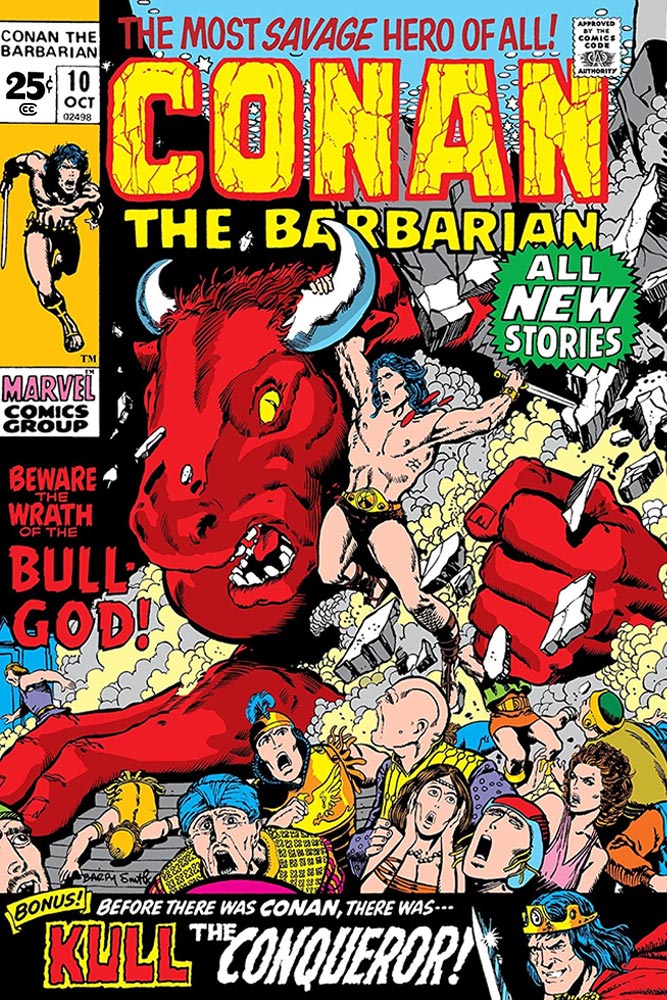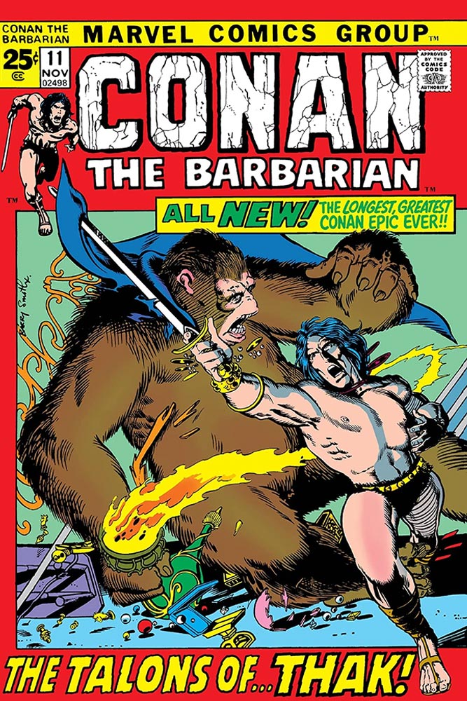 Since originally posting this, I’ve gotten two more of these 25-cent issues, cover-dated November 1971, Fantastic Four #116 and Conan #11. The FF issue—by Archie Goodwin (I think the first non-Stan Lee written or plotted issue ever), with art by John Buscema and Joe Sinnott is another great comic, up there with Thor #193 and Captain America #143. I have no idea how Buscema did TWO 34-page stories in one month, but there’s absolutely no loss in the quality of his art and both these books prove he is the true heir to Jack Kirby at Marvel. Conan #11 is (pre-Savage Sword of Conan days) “the longest, greatest Conan epic ever!” (as the cover breathlessly proclaims) and is 34 pages of pure Barry Smith (inked by Sal Buscema, who also inked Thor #193, another Buscema boy with 68 pages under his belt for a single month), while he’s still solidly in that transition phase from awkward cartoonist in Conan #1 to accomplished artist in his final issue, #24. I almost wish Marvel would reprint all these 34-page stories in one book; even though I know there’s a few dogs in this bunch, it’s certainly a special time-in-a-bottle moment, and it surprises me that so many of these books are so great, at least art-wise, when everyone involved must have been severely under the gun, deadline-wise.