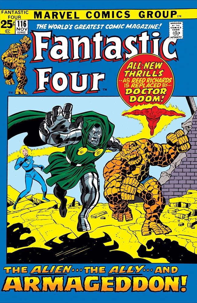 Marvel tentatively dipped their big toe in the pool in July 1971 (with books cover-dated October) with six books: Astonishing Tales #8, Conan the Barbarian #10, Marvel Feature #1 (featuring the debut of the Defenders—Sub-Mariner, Hulk, and Dr. Strange as Marvel’s newest super-team), Monsters on the Prowl #13, Rawhide Kid #92, and Sgt. Fury #92. The Bullpen Bulletins page that month announced, “… This is the month that several of our much-lauded mags are going double-size to a full, fabulous 52 pages—for a mere 25¢. Yes, you heard right—for a mere extra dime, you’ll now be getting twice as much action—double the excitement … As for what the future holds in store for the rest of our magniloquent mags—well, keep lookin’ forward, pilgrim, ‘cause that’s where the future’s coming from!”