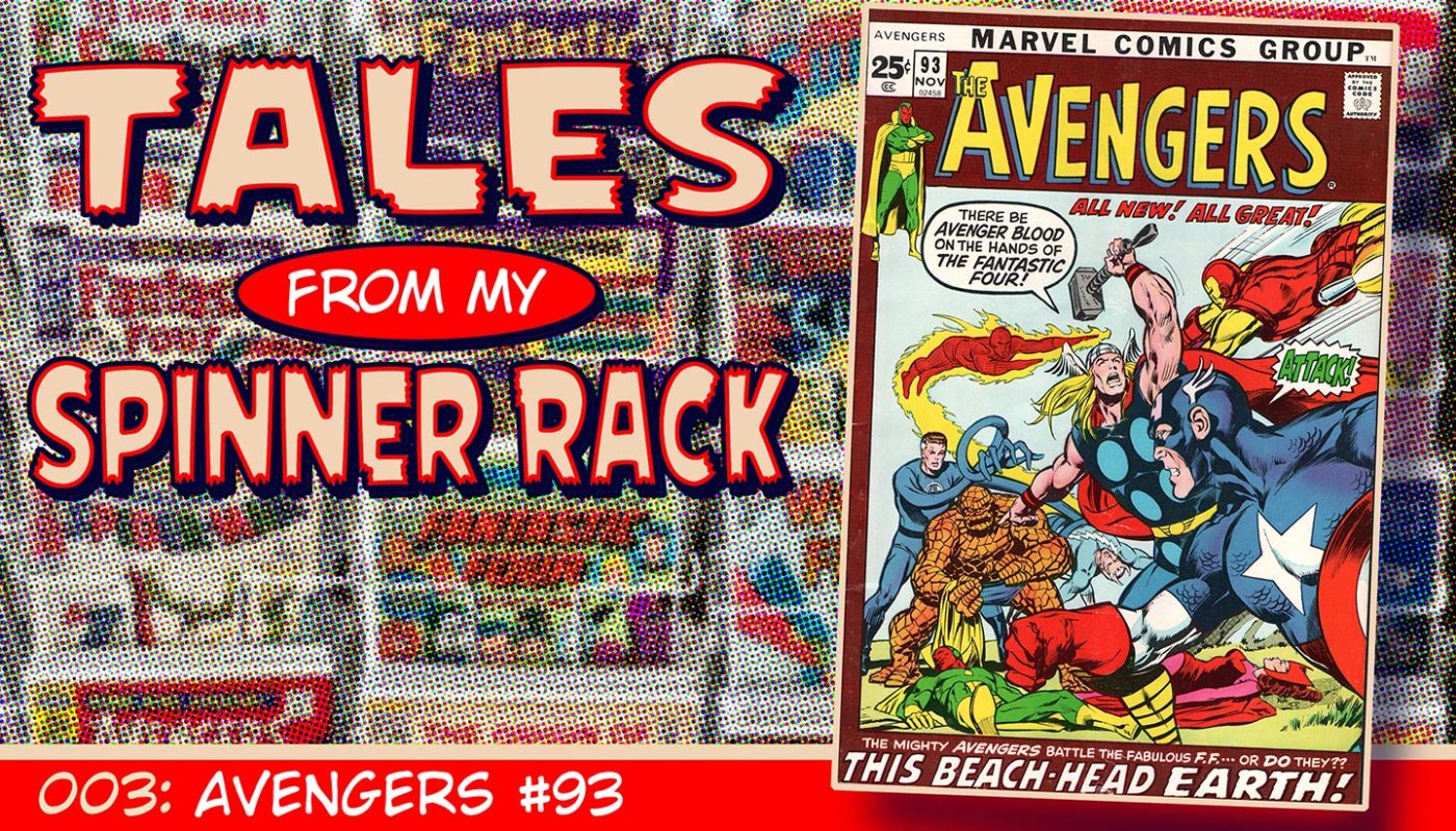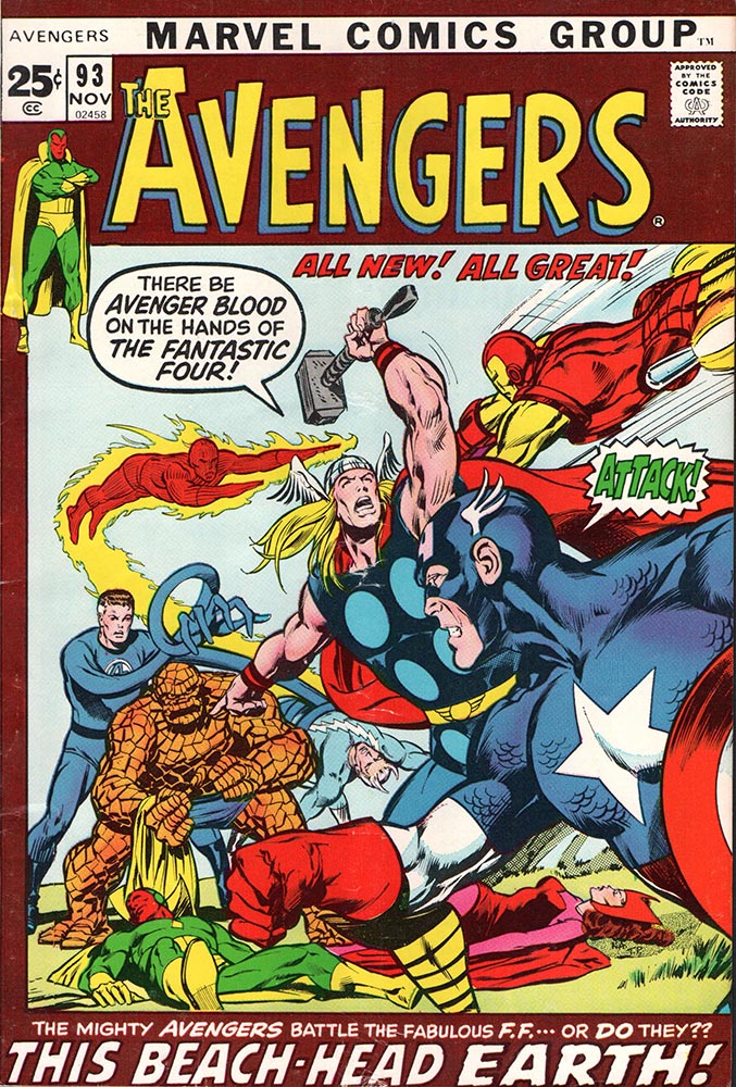 Avengers #93, cover dated November 1971, but on sale in August of that year, is special for a number of reasons. First off, it’s the first Avengers issue drawn by Neal Adams and inked by Tom Palmer (written by Roy Thomas, who by this point in time had made the title his own). Secondly, it came out in the month that revealed a new cover format for Marvel Comics, with the image in a picture frame below each book’s logo type and with a solid color background surrounding it; text reading “MARVEL COMICS GROUP” ran in a banner across the top of each book, moving from its usual spot on the familiar corner boxes on all covers, which also all buy disappeared in this change. And thirdly and most importantly, Avengers #93 cost 25 cents in a month where most Marvel releases increased a dime in price from 15 cents. And therein lies our tale …