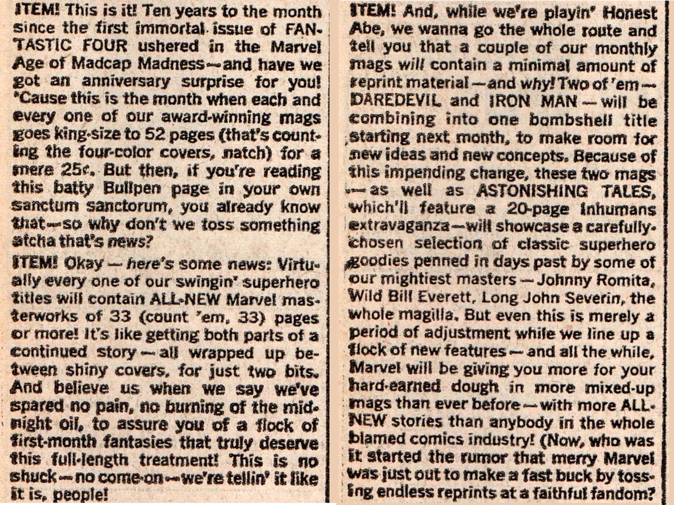 There was, of course, an official announcement from Marvel that month, both on the letter pages of each issue and in the Bullpen Bulletins page. That “ITEM!”—and an additional one—reveal a bit more about their plans, and make it sound like they were pretty much concrete at that point. One of the more interesting things is that Daredevil and Iron Man were going to combine into a split book that very next month, which is one way of solving the 34-page story conundrum. Here’s the original blurbs, pasted up into one graphic for space saving …