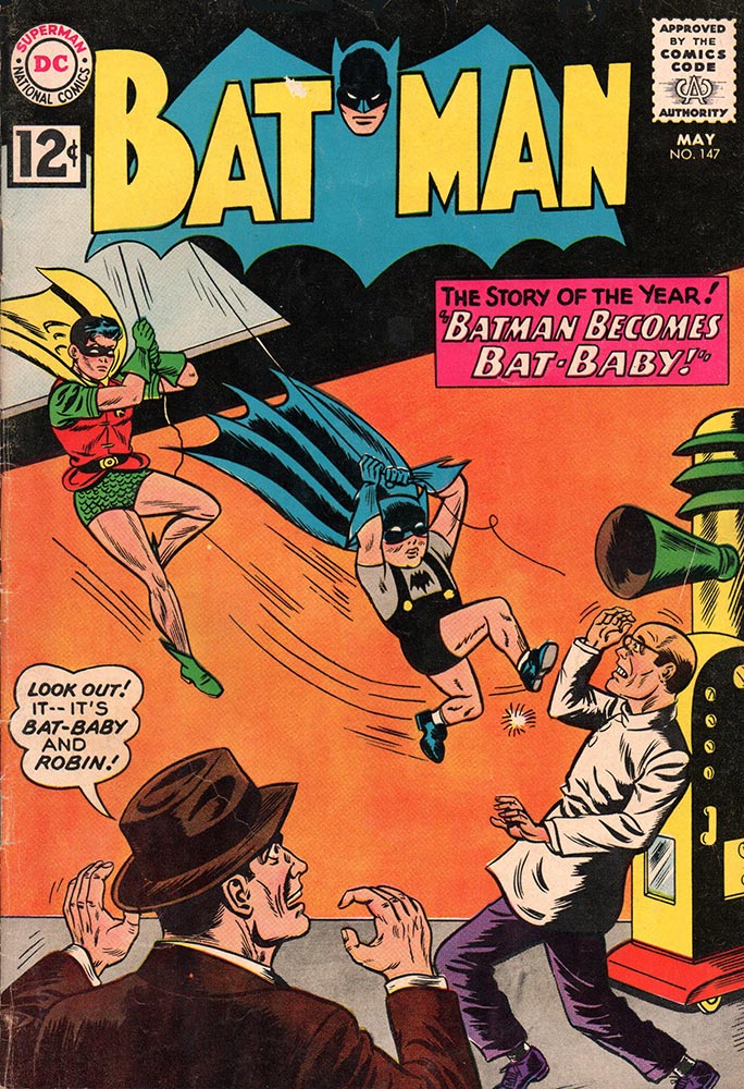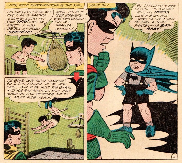 Batman and Robin are hot on the heels of Nails Finney and his gang. An anonymous tip brings them to a building one night, but it’s a trap! Batman walks into a mysterious ray from an equally mysterious machine and he starts to shrink (not an uncommon occurrence in comics in the 1960s). But no! He’s not shrinking … his growth is being reversed! After the compromised Batman escapes in Robin’s arms, the evil scientist, Garth, gloats to Nails: “Instead of making a dead Batman into a martyr—we’ve made a live Batman into a laughing stock!” But fortunately, as teensy-weensy Brucie Wayne figures out, only his growth has been affected. Batman still has his adult strength and intelligence, which unfortunately doesn’t stop him from putting on a pair of little black shorts (with suspenders) and little grey socks with his little black booties, as he proclaims: “So gangland is now calling me a baby! Well, I’ll dress like a baby, and prove to them that I’m still a crime-fighter—as Bat-Baby!” It doesn’t quite have the ring of “Criminals are a superstitious, cowardly lot, so my disguise must be able to strike terror into their hearts. I must be a creature of the night, black, terrible, a … bat!”, but okay, fine. You be you, Bat-Baby.