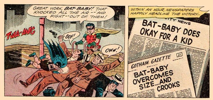 So the somewhat compromised Dynamic Duo go fight crime, causing Bat-Baby to observe, “My legs are too short to keep up with Robin!” and instead he jumps on a helium-filled balloon. “It’s only because I don’t weigh much that this helium-filled balloon will carry me right up to the roof!” The terrifying sight of Bat-Baby instantly instills fear and confusion into the hearts and minds of the criminals: “It—It’s Bat-Baby!”