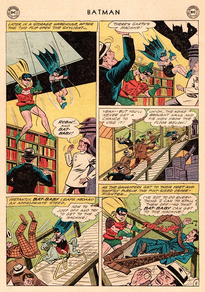 After an almost close-encounter with current Bat-squeeze Kathy Kane (she’s Batwoman!), Bat-Baby decides that this baby thing is great for surveillance, so he hangs out at a kids’ playground and spots Nails Finney. Having the foresight to “cache a pair of skates at the park,” Bat-Baby, disguised in his civilian persona as little Brucie Wayne, follows Nails back to a warehouse. Bat-Baby and Robin return that night, and round up the bad guys in an action-packed sequence, wherein BB “instantly … leaps upon an appropriate steed”—a hobby horse—and bashes the gangsters. Off panel, he turns on Garth’s ray, which instantly transforms him into Batman once again. “Yes, I discarded my Bat-Baby garb and slipped on this plastic costume I had folded up in a pants pocket.” (I guess those Bat-Shorts had Bat-Pockets.) And “That night, the Bat-Cave’s famed Trophy Room has a new trophy …” Bat-Baby’s cute little costume, encased in a glass box, just like the costume of the dead Robin, Jason Todd, who was beaten to death with a crowbar by the Joker, will be showcased later. The End.