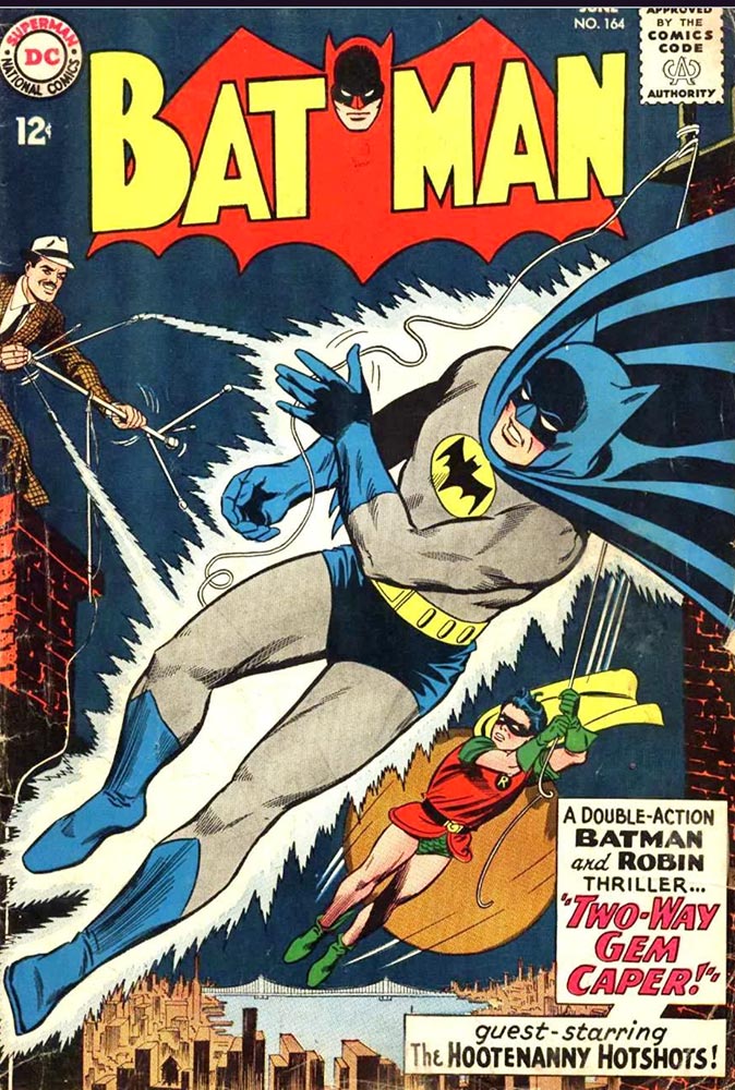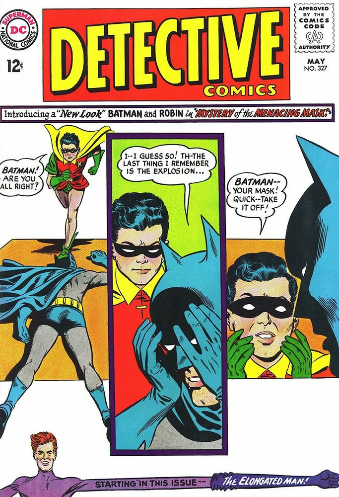 Julius Schwartz had proven himself to be the go-to superhero revival guy, so he was charged with using CPR (Comics Reboot Powers) to bring Batman back to life. He proceeded to do this with the “New Look Batman” that started in Detective Comics #327 (May 1964) and Batman #164 (June 1964), bringing on Carmine Infantino to draw the covers and some stories, at least those not guaranteed to Bob Kane by his contract. When Infantino was promoted to editorial director (and later DC Comics publisher) in a few years, he renegotiated Kane’s contract, and finally Bob Kane didn’t have to pretend to be the sole writer, penciller, inker, letterer, colorist, and janitor of Batman comics at DC, although that didn’t stop him from trying to hog that Bat-Signal spotlight until the day he died.