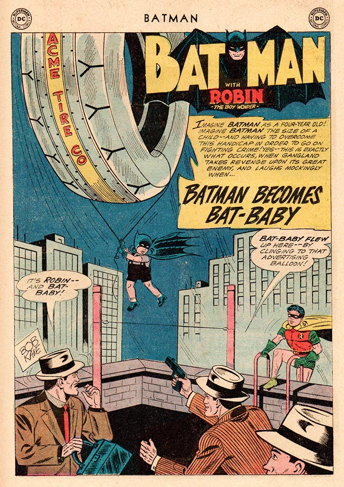 So the somewhat compromised Dynamic Duo go fight crime, causing Bat-Baby to observe, “My legs are too short to keep up with Robin!” and instead he jumps on a helium-filled balloon. “It’s only because I don’t weigh much that this helium-filled balloon will carry me right up to the roof!” The terrifying sight of Bat-Baby instantly instills fear and confusion into the hearts and minds of the criminals: “It—It’s Bat-Baby!”
