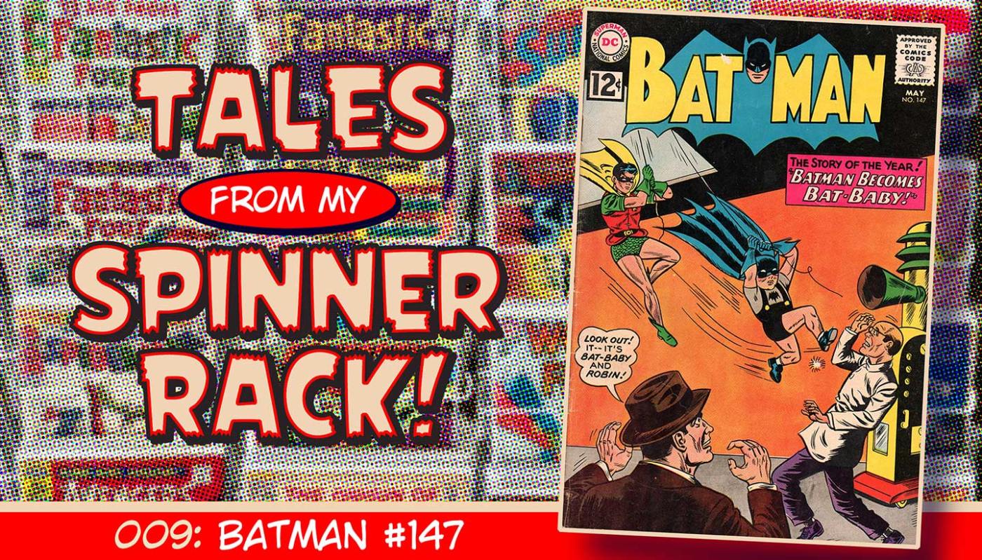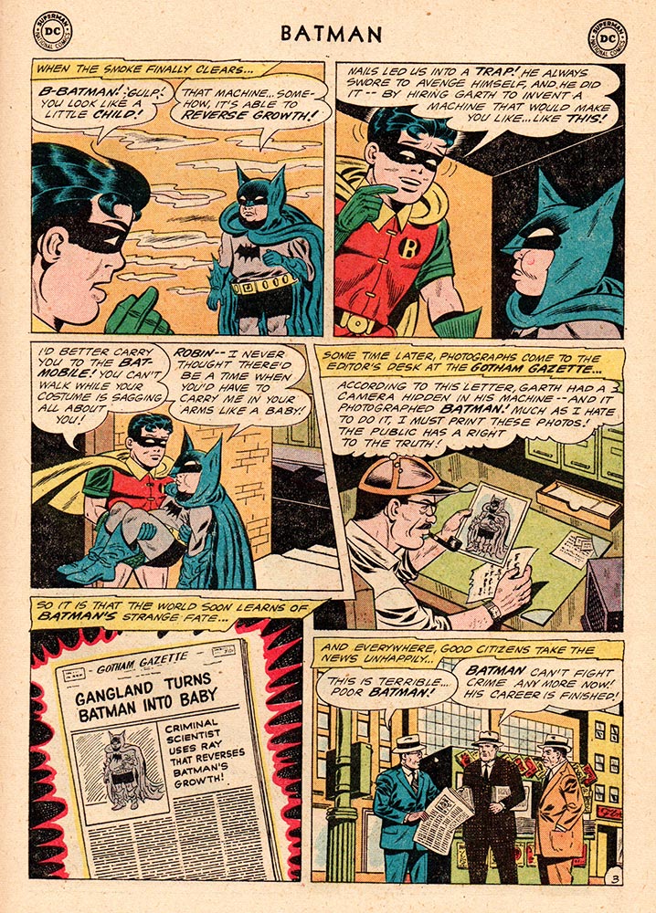 Batman and Robin are hot on the heels of Nails Finney and his gang. An anonymous tip brings them to a building one night, but it’s a trap! Batman walks into a mysterious ray from an equally mysterious machine and he starts to shrink (not an uncommon occurrence in comics in the 1960s). But no! He’s not shrinking … his growth is being reversed! After the compromised Batman escapes in Robin’s arms, the evil scientist, Garth, gloats to Nails: “Instead of making a dead Batman into a martyr—we’ve made a live Batman into a laughing stock!” But fortunately, as teensy-weensy Brucie Wayne figures out, only his growth has been affected. Batman still has his adult strength and intelligence, which unfortunately doesn’t stop him from putting on a pair of little black shorts (with suspenders) and little grey socks with his little black booties, as he proclaims: “So gangland is now calling me a baby! Well, I’ll dress like a baby, and prove to them that I’m still a crime-fighter—as Bat-Baby!” It doesn’t quite have the ring of “Criminals are a superstitious, cowardly lot, so my disguise must be able to strike terror into their hearts. I must be a creature of the night, black, terrible, a … bat!”, but okay, fine. You be you, Bat-Baby.