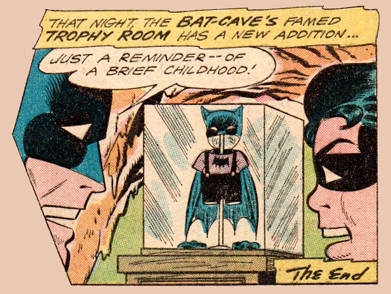 After an almost close-encounter with current Bat-squeeze Kathy Kane (she’s Batwoman!), Bat-Baby decides that this baby thing is great for surveillance, so he hangs out at a kids’ playground and spots Nails Finney. Having the foresight to “cache a pair of skates at the park,” Bat-Baby, disguised in his civilian persona as little Brucie Wayne, follows Nails back to a warehouse. Bat-Baby and Robin return that night, and round up the bad guys in an action-packed sequence, wherein BB “instantly … leaps upon an appropriate steed”—a hobby horse—and bashes the gangsters. Off panel, he turns on Garth’s ray, which instantly transforms him into Batman once again. “Yes, I discarded my Bat-Baby garb and slipped on this plastic costume I had folded up in a pants pocket.” (I guess those Bat-Shorts had Bat-Pockets.) And “That night, the Bat-Cave’s famed Trophy Room has a new trophy …” Bat-Baby’s cute little costume, encased in a glass box, just like the costume of the dead Robin, Jason Todd, who was beaten to death with a crowbar by the Joker, will be showcased later. The End.