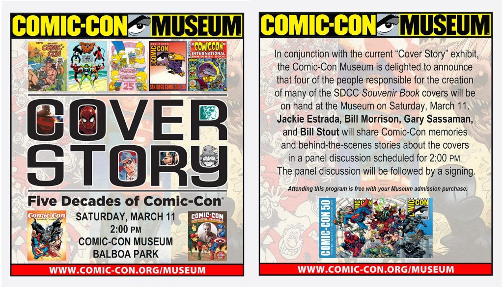 In conjunction with the current “Cover Story” exhibit, the Comic-Con Museum is delighted to announce that four of the people responsible for the creation of many of the SDCC Souvenir Book covers will be on hand at the Museum on Saturday, March 11. Jackie Estrada, Bill Morrison, Gary Sassaman, and Bill Stout will share Comic-Con memories and behind-the-scenes stories about the covers in a panel discussion scheduled for 2:00 PM. The panel discussion will be followed by a signing. Attending this program is free with your Museum admission purchase.