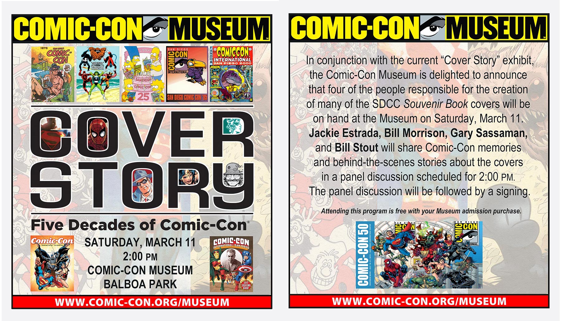 In conjunction with the current “Cover Story” exhibit, the Comic-Con Museum is delighted to announce that four of the people responsible for the creation of many of the SDCC Souvenir Book covers will be on hand at the Museum on Saturday, March 11. Jackie Estrada, Bill Morrison, Gary Sassaman, and Bill Stout will share Comic-Con memories and behind-the-scenes stories about the covers in a panel discussion scheduled for 2:00 PM. The panel discussion will be followed by a signing. Attending this program is free with your Museum admission purchase.