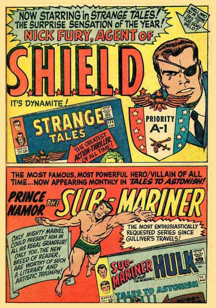 This could be the start of something big … House ad for the new Nick Fury feature in Strange Tales; the first cover by Jack Kirby; and the third issue cover by John Severin, who briefly pencilled and inked the book. TM & © MARVEL.