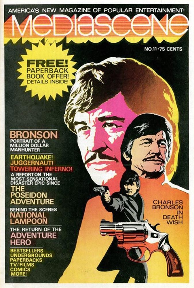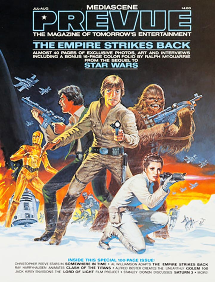 Top row: From Comixscene to Mediascene to Prevue, Steranko’s magazine lasted 92 issues spanning two decades. Bottom row: Chandler was the first graphic novel, according to Steranko; the artist also produced pre-production paintings for Raiders of the Lost Ark and a comics adaptation of the movie Outland, appearing in Heavy Metal. © Steranko; Star Wars and Raiders © Lucasfilm Ltd.; Outland © Warner Bros.