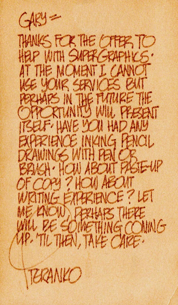 He lived about 35 miles away from me, in Reading, PA, and once on a whim I wrote him about a possible job with Supergraphics. He did write back and I’ve kept the postcard to this day, because his handwriting—which is becoming more and more faded each time I look at it—is a work of art in and of itself. I think this was before I attended the Art Institute of Pittsburgh, so the answers to all his questions are a big fat NO, not to mention my mother saying, “You are NOT going to work for some stranger in Reading!” For some reason, there’s no postmark on the postcard, but I’m guessing it’s circa 1970 to 1972; it may even be 1973 after I graduated high school.