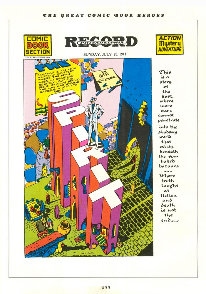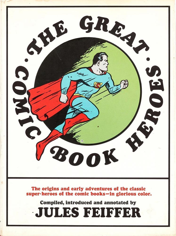 I was ten years old when I first discovered The Spirit within the pages of Jules Feiffer’s The Great Comic Book Heroes. A hardbound book published in 1965, it featured Feiffer’s reminiscences of growing up with comics. Feiffer was a former assistant to Eisner and had become a cartoonist, playwright, and social commentator, famous for his comic strip, Feiffer, in New York City’s The Village Voice newspaper. He was persuaded by a young editor—E. L. Doctorow, who would go onto his own stellar literary career with fiction books like Ragtime and World’s Fair—to write a book about the comic book heroes who thrilled Feiffer in his youth. The resulting book—published by Dial Press—featured Feiffer’s essay on his childhood heroes and reprinted a number of stories with great reproduction on good paper in a larger format. We had never seen comics look this good. The book was heavy on DC Comics heroes, including Superman, Batman, Wonder Woman, The Flash, Green Lantern, Hawkman, and The Spectre, and a one-page glimpse of Captain Marvel (all that was legally allowed at the time). Timely Comics (Marvel’s predecessor) was represented with Captain America’s origin story (by Simon & Kirby), and separate Human Torch and Sub-Mariner stories, and a lone Quality Comics Plastic Man story, featured his origin by Jack Cole. And bringing up the rear of the book was a story reprinted from the July 20, 1941 Spirit Section by Will Eisner.
