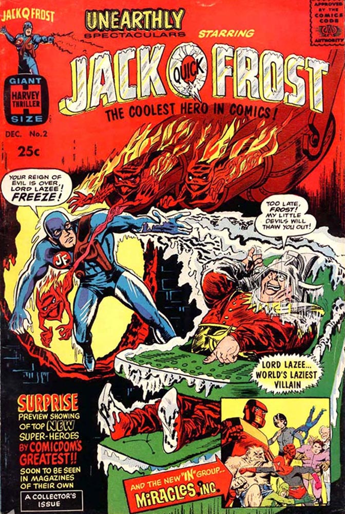 Harvey’s new “Thriller” line was edited by old comics pro Joe Simon, the erstwhile partner to Jack Kirby. The duo co-created Captain America, the Boy Commandos, the Guardian and the Newsboy Legion, and after the war, invented the romance comics genre and contributed heavily to both the crime (Justice Traps the Guilty) and horror (Black Magic) genres. They had stopped off at Harvey Comics before, creating some of their most memorable post-war titles: Stuntman, Boys Ranch, and Boy Explorers. In the late 1950s, Simon and Kirby went their separate ways, with Kirby eventually ending up at soon-to-be Marvel with Stan Lee and Simon becoming an editor and packager of titles at Harvey Comics while also editing Sick magazine, a MAD-like humor publication. During the superhero renaissance in the mid-1960s, Simon brought back his and Kirby’s 1950s superhero, Fighting American for a one-shot reprint title in Harvey’s “Harvey Giant” format, which cost 25¢. And either Simon—or Harvey president and editor Leon Harvey—was smart enough to bring back Will Eisner’s The Spirit for two Harvey Giant issues, reprinting some of the very best of the legendary cartoonist’s comics stories from his ground-breaking syndicated newspaper comic book section.