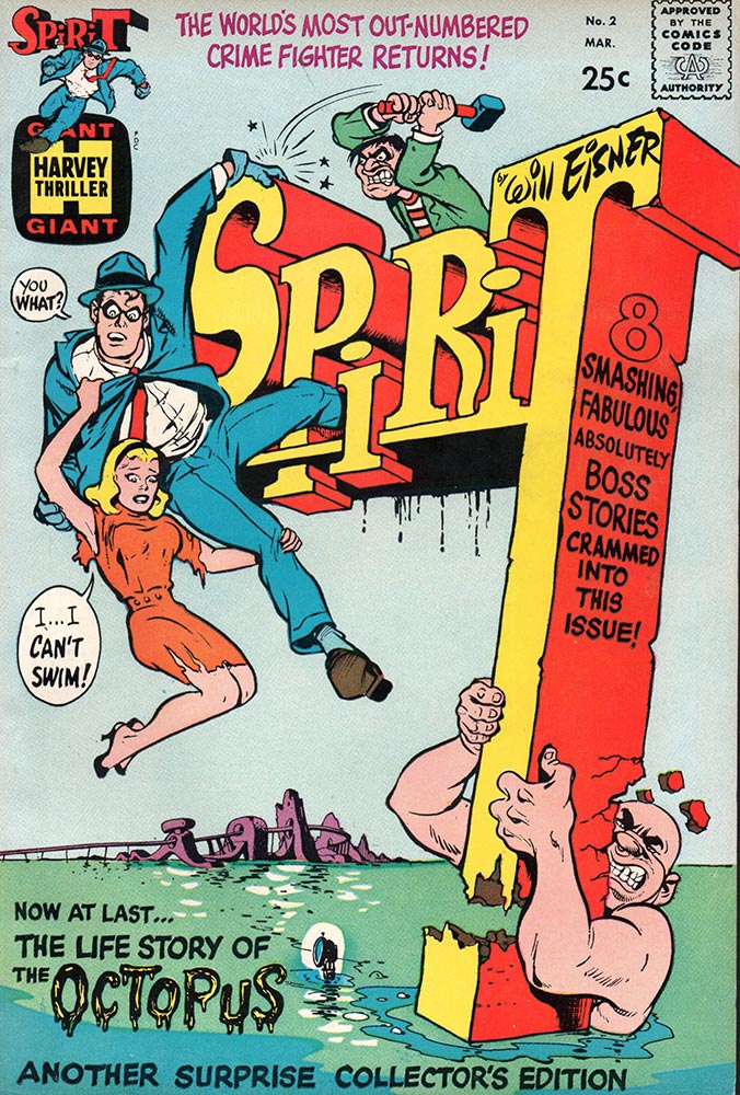 Harvey’s revival of The Spirit lasted only two issues (each also featured new Eisner covers). The second issue came out more than six months later, cover-dated March 1967. This one also included a new seven-page story featuring the return of The Spirit’s arch-nemesis, The Octopus, plus an additional two-pager and seven reprinted Spirit Section stories. There was a one-page preview of issue #3, but unfortunately Harvey’s interest in superhero—or non-super superhero—comics went away and they returned to the kind of fine comics literature they would become renowned for for the rest of their publishing years: the adventures of super-capitalist Richie Rich, the world’s richest boy.