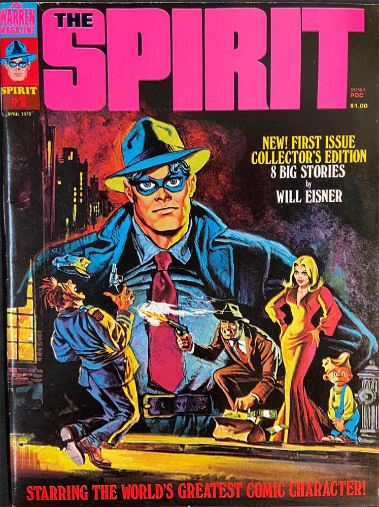 But those two issues inspired another two issues—sometimes called “The Underground Spirit”—this time published by underground comix cartoonist Denis Kitchen, with new covers and some new stories by Eisner, although the bulk of each book is reprint material from the Spirit Sections. Eisner was fascinated by the freedom the underground cartoonists had to produce their work, which wasn’t distributed through newsstands or other traditional channels. In 1974, James Warren came a’calling and The Spirit got Warren’s signature black-and-white magazine treatment, featuring reprints from the Spirit Sections and new color covers. At this time, Warren started experimenting with painted color in his comics, and some of Eisner’s cover drawings were colored by Richard Corben, or featured Eisner art painted by Warren cover artists like Ken Kelly. Warren’s The Spirit magazine lasted 16 issues. Kitchen Sink picked it up with #17, and continued to publish Spirit comics in various formats into the 1990s when the company folded. They also published Will Eisner Quarterly and The New Adventures of The Spirit, featuring stories by other artists and writers; publisher Denis Kitchen was Eisner’s agent during this time, too.