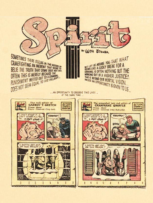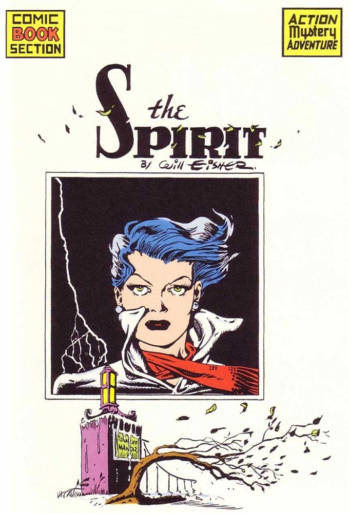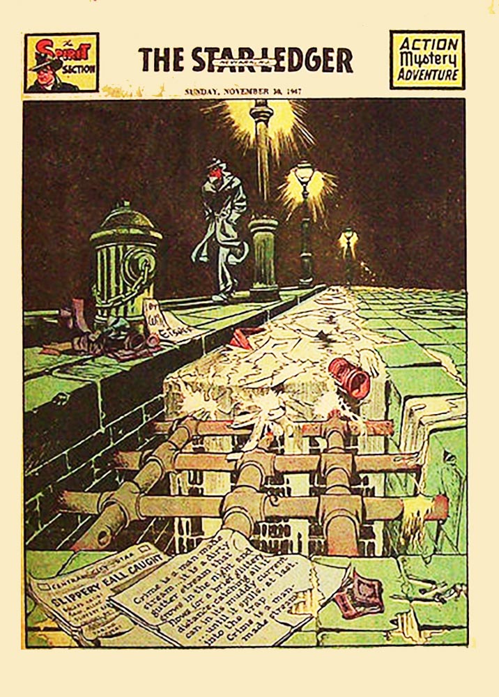 In 1940 Eisner was approached by Quality Comics publisher Everett “Busy” Arnold, who had an idea for a 16-page comic book-sized section to be syndicated to newspapers across the country. Newspaper owners felt the increasing popularity of comic books was impacting their own comics sections, both on a daily and full-color Sunday basis. Arnold’s idea for a weekly comic book section would feature an eight-page story of Eisner’s signature character, “The Spirit,” a decidedly un-superheroic superhero, and a back-up feature (until 1944 that was “Mr. Mystic,” written by Eisner and drawn by Bob Powell, among others, and later “Lady Luck,” originally written by Eisner and drawn by various artists including Nick Cardy and Klaus Nordling; humor strips such as “Clifford” by Jules Feiffer and “Jonesy” by Bernard Dibble filled the remaining pages). The Spirit—formerly detective Denny Colt—got himself killed and then returned to enter into all kinds of adventures involving crime, mayhem, exotic locations, and beautiful women. Eisner went off to war in early 1942, where he stayed stateside, creating a series of maintenance manuals told in comics style for the Army, and returned to The Spirit at the end of 1945. And that’s when he really made the strip into something special.