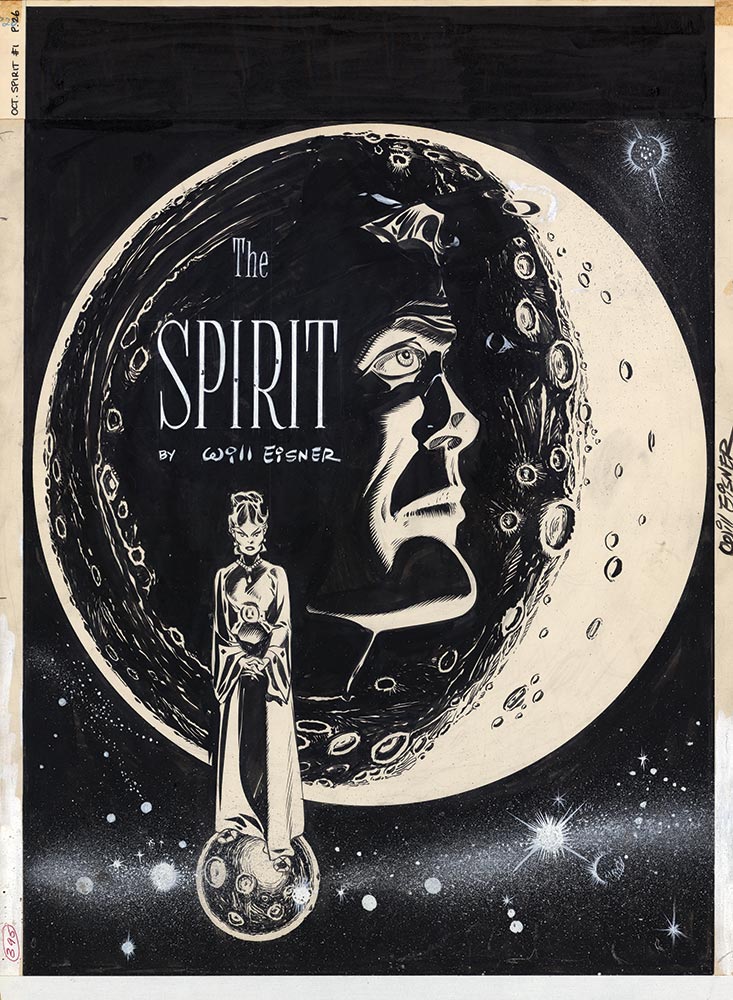The splash pages for the stories reprinted in Harvey’s The Spirit #1, including the original art to that striking moon page. © Will Eisner Studios, Inc.