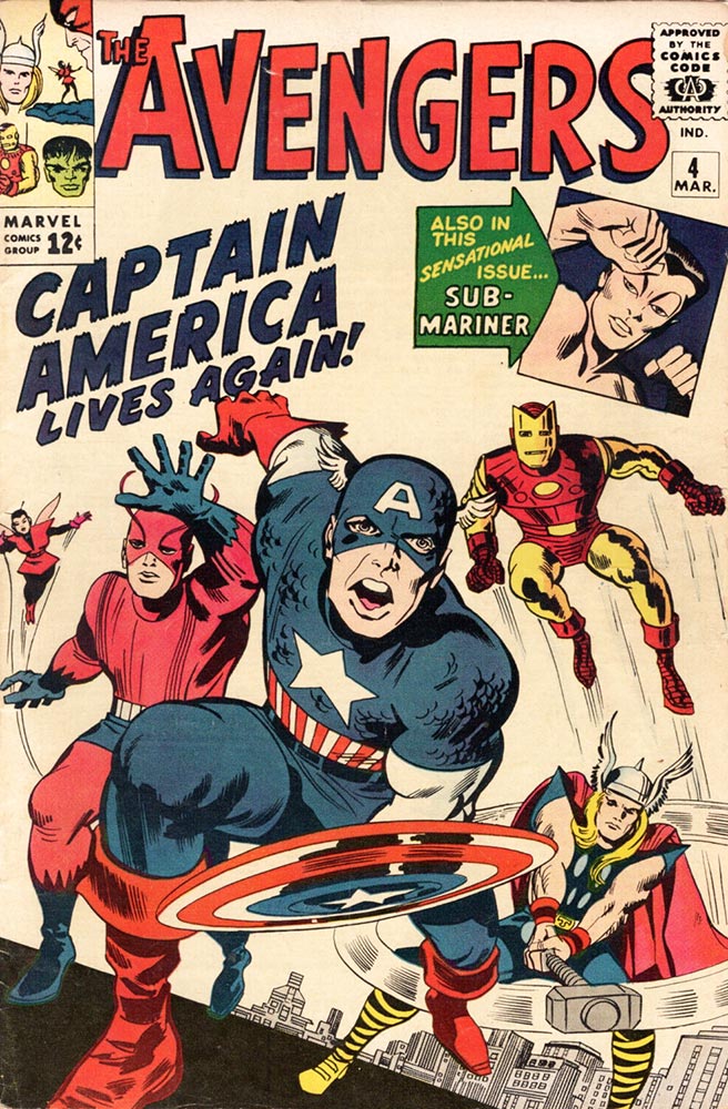 The letters must have been hot and heavy for Cap’s return, because less than five months later, the “real” Captain America returned in Avengers #4 (cover-dated March 1964), discovered in a block of ice by none other than his old Timely pal, Prince Namor, the Sub-Mariner. The Avengers thaw him out and he lives again, surviving on the basis of the super-serum that runs through his veins which kept him a state of perfect suspended animation (the ice helped, too, no doubt). Within a few months, Cap started the above-mentioned series in Tales of Suspense.