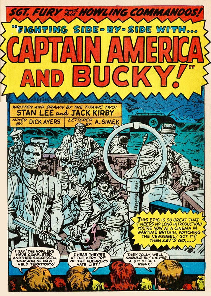 From Sgt. Fury #13 … Cap & Bucky are introduced via newsreel (far left); the climactic battle and big blow-up in the tunnel under the English Channel is reminiscent of the 1960 film, The Guns of Navarone—at least to me!