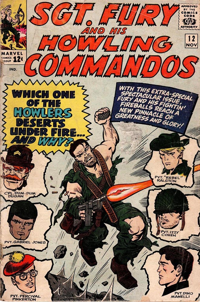 Sgt. Fury and His Howling Commandos premiered on March 5, 1963 (cover-dated May), a few months shy of the other two big 1963 premieres from Marvel, The Avengers and X-Men (both of which came out in July). Fury was written by Stan Lee and drawn by jack Kirby for the first seven issues, with issues #1-3 inked by Dick Ayers (good!) and #4-7 by George Bell (bad!). Ayers took over the pencilling chores in issue #8, still inked by the incredibly clunky and heavy-handed Bell (aka George Roussos), and the book took an almost immediate downturn, at least in the art. Kirby still handled the covers, though, and some of them are busy masterpieces, particularly #s 14, 16, 17, and 20. Stan and Jack seemed to enjoy telling stories about characters who didn’t have superpowers and capes, while simultaneously reminding us of what Marvel was all about. House ads for Sgt. Fury proclaimed, “Action in the Fantastic Four style!” And “First, the Fantastic Four! And now, in the same inimitable style, by the same writer and artist … Another group of fabulous characters!” Lee also inserted both Reed Richards and Ben Grimm into Sgt. Fury #3, thus firmly placing the book into the Marvel Universe (before it was actually called that).