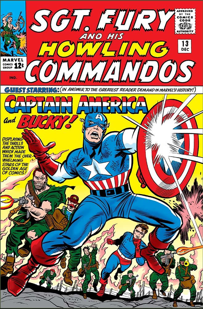 Sgt. Fury and His Howling Commandos #13 was released on October 8, 1964, with a cover date of December of that year. Two months earlier, Captain America made his Marvel series premiere in Tales of Suspense #59. Cap’s return to the burgeoning Marvel Universe was slow in coming. The Human Torch—or at least a new iteration of the character—was present at the beginning in Fantastic Four #1 in 1961; Sub-Mariner returned six months later in FF #4. But the missing character in Timely’s (Marvel’s original comics company name) trinity, Captain America, slowly worked his way back into the newly-named company, starting with a bit of a bogus appearance in the Human Torch story in Strange Tales #114 (cover dated November 1963). This turned out to be a fake Cap—you can tell by the red briefs he’s wearing—who is ultimately foiled by the Torch. But this issue did show a Captain America who was a very talented gymnast, and co-creator Jack Kirby clearly missed his signature Marvel character, created with partner Joe Simon way back when in 1940; his drawings of “Cap” (actually an older Human Torch foe called “The Acrobat”), show him in incredible action poses, running, jumping, and fighting like the legendary Simon & Kirby tales from the early 1940s. The Strange Tales story ended with Stan admitting: “You guessed it! This story was really a test! To see if you too would like Captain America to return! As usual, your letters will give us the answer!”