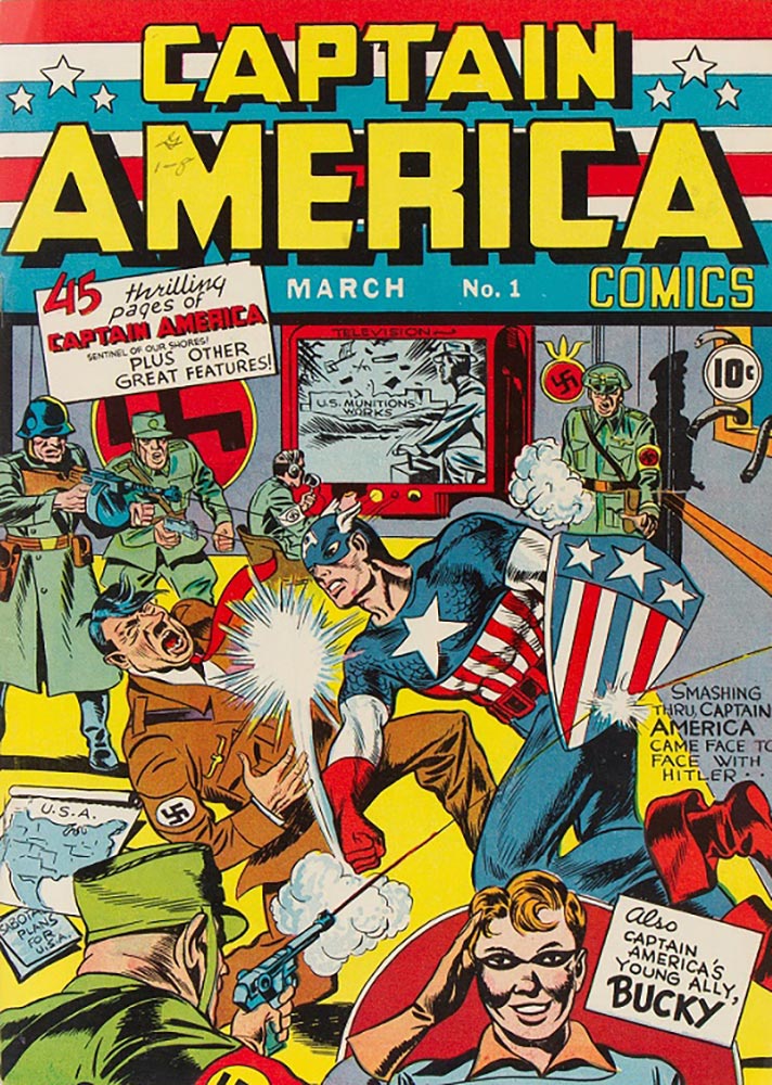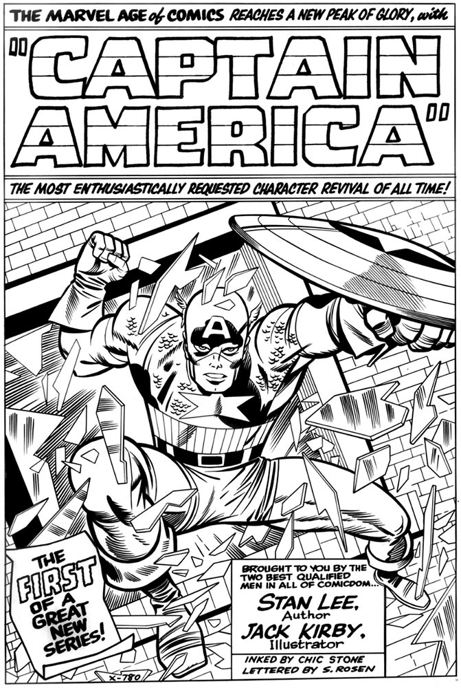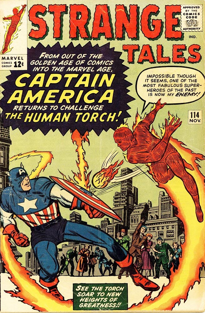 Captain America’s re-introduction in the Marvel Age of Comics started with an appearance by a bogus Cap in Strange Tales #114 (center). Simon & Kirby’s first issue (far left) was published in late 1940; the real Cap returned in Avengers #4 in early 1964.