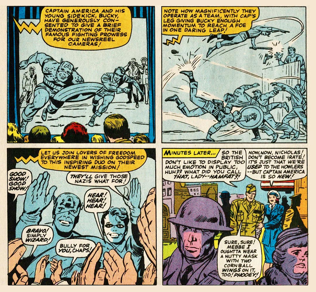 As mentioned, it’s that cover that makes this issue so near and dear to me, with it’s incredibly dynamic Cap pose and typical Stan the Man cover hyperbole: “Guest starring (In answer to the the greatest reader demand in Marvel’s history!): Captain American and Bucky!” “Displaying the thrills and action which made them the overwhelming stars of the Golden Age of Comics!” To me at least, it’s kind of funny that Lee seemed so tentative in bringing Captain America back. With Kirby firmly entrenched at Marvel and Cap fondly remembered as his most famous creation from the Golden Age, I wonder why there was a certain level of hesitation; did Stan think the patriotic ideal of Captain America was too old-fashioned for the 1960s? In 1964, full-blown protests against the Vietnam War weren’t prevalent yet. And the whole idea of Cap’s return, as a man from a different era, clearly out of step with his new place in time, definitely helped ease him into the Marvel Age of Comics. But Cap’s first stories were anything but easy; Lee and Kirby almost immediately plunged him back into World War II era stories in his Tales to Suspense run, after a few beautifully-drawn but “fight of the month club” modern era stories. It would take a couple of years until Cap found his footing in ToS and eventually, after he graduated to his own title in 1968, that whole “trapped in a world he never made” thing—common to both Cap and Howard the Duck—would come home to roost with Steve Englehart’s stories chronicling Cap’s disillusionment with America.