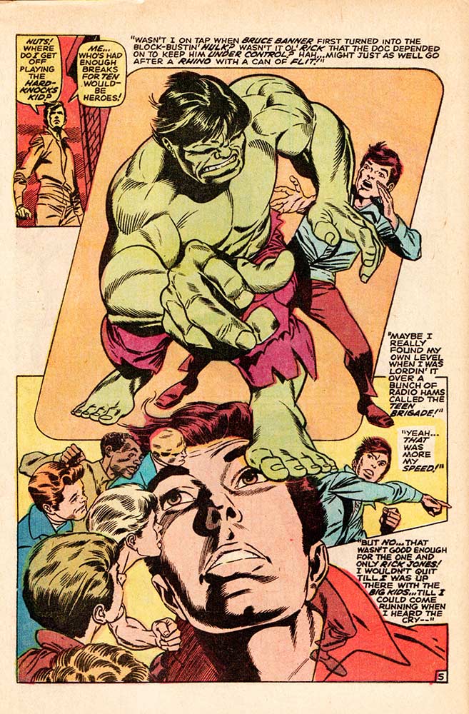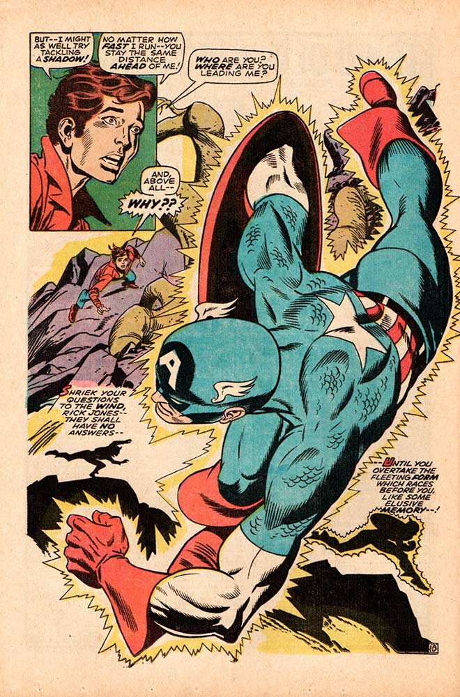 Marvel’s alien super-hero named Captain Marvel was going nowhere, and I—as his second but not current writer—came up one Saturday morning with the notion of turning the Kree warrior named Mar-Vell into an echo of the original (Fawcett) Captain Marvel, only with science-fiction trappings this time instead of magical ones, and with young Rick Jones as his “Billy Batson.”