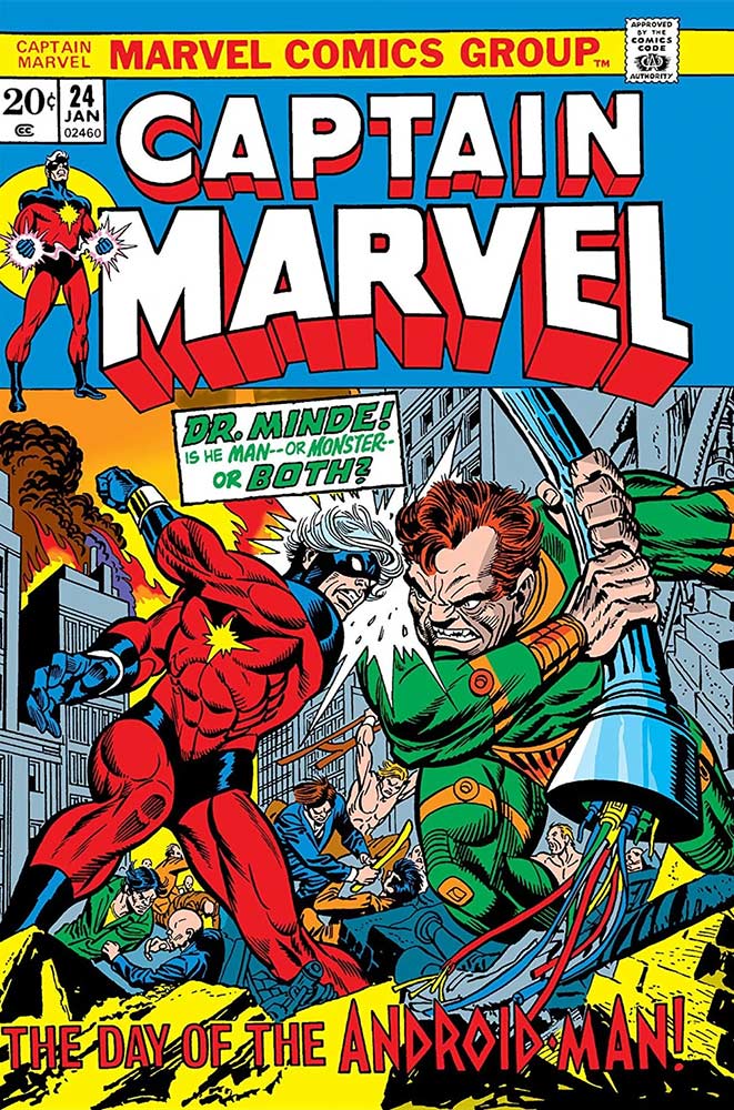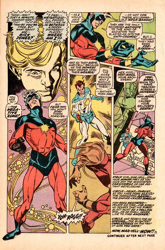 Captain Mar-Vell quickly graduated to his own series and meandered around the Marvel Universe until Roy Thomas returned with issue #17 alongside artist Gil Kane. Thomas augmented the character with the addition of Marvel’s perennial bridesmaid, Rick Jones, who now shared space with Captain Marvel. Discovering a pair of golden bracelets in a cave, Rick Jones is compelled by a force in another dimension to don them and bang them together, and—SHAZAM!—the “Sensational New” Captain Marvel is born, replete with a spiffy new costume. Cap and Jones share the same consciousness and communicate with each other, but only one at a time can exist on Earth, relegating the other to the Negative Zone (another Fantastic Four creation) once the wristband-clashing commences. This neat little plot device by Thomas brings Marvel’s Captain Marvel just a bit closer to the original Billy Batson/Big Red Cheese dynamic, where a kid is the Captain’s alter ego, albeit Rick Jones is the Marvel Universe’s oldest teenager.