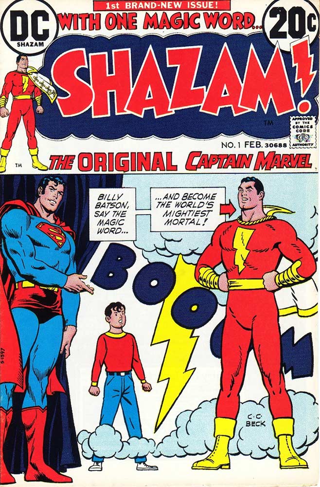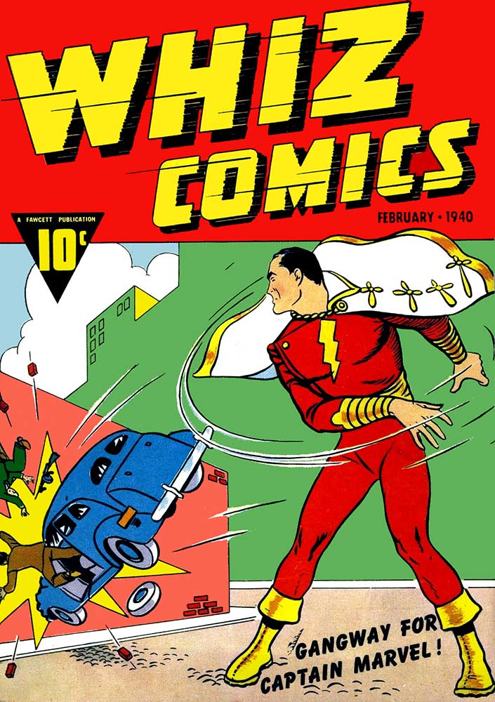 Every time Billy Batson says the magic wizard’s name, he’s struck by a bolt of lightning and becomes Captain Marvel. The comic book was charmingly illustrated by C.C. Beck, among others, and had a look and feel unlike any other comic of its time. As such, it sold extremely well … so well, in fact, it promptly woke the not-so-sleeping giant of National Comics (DC today) and started a decade-plus lawsuit about the similarities between the Big Red Cheese (Capt. Marvel) and the Man of Steel (Superman). (Let’s face it: That whole tossing the car thing on the introductory cover of Whiz Comics is pretty damn similar to Action Comics #1.)