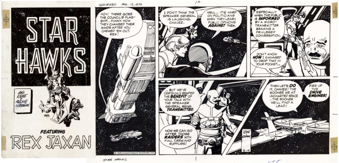 Gil Kane’s work at DC Comics in the early 1960s was always enjoyable on titles such as Green Lantern and The Atom, but he really started to stretch when he published his own creation, His Name Is Savage! in 1968, followed by Blackmark in 1971 (from Bantam Books); Will Eisner and Gil Kane at San Diego Comic-Con in 1975, and one of his double-tiered Star Hawks daily strips in the bottom row. Art TM & © Respective Owners.
