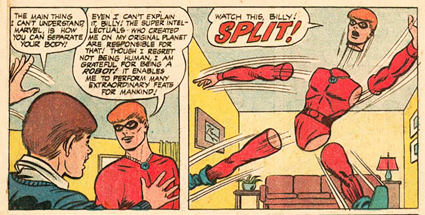 Myron Fass’s knock-off Captain Marvel drawn by Human Torch creator Carl Burgos, had one of the more disgusting power-sets in comics, even for a robot.
