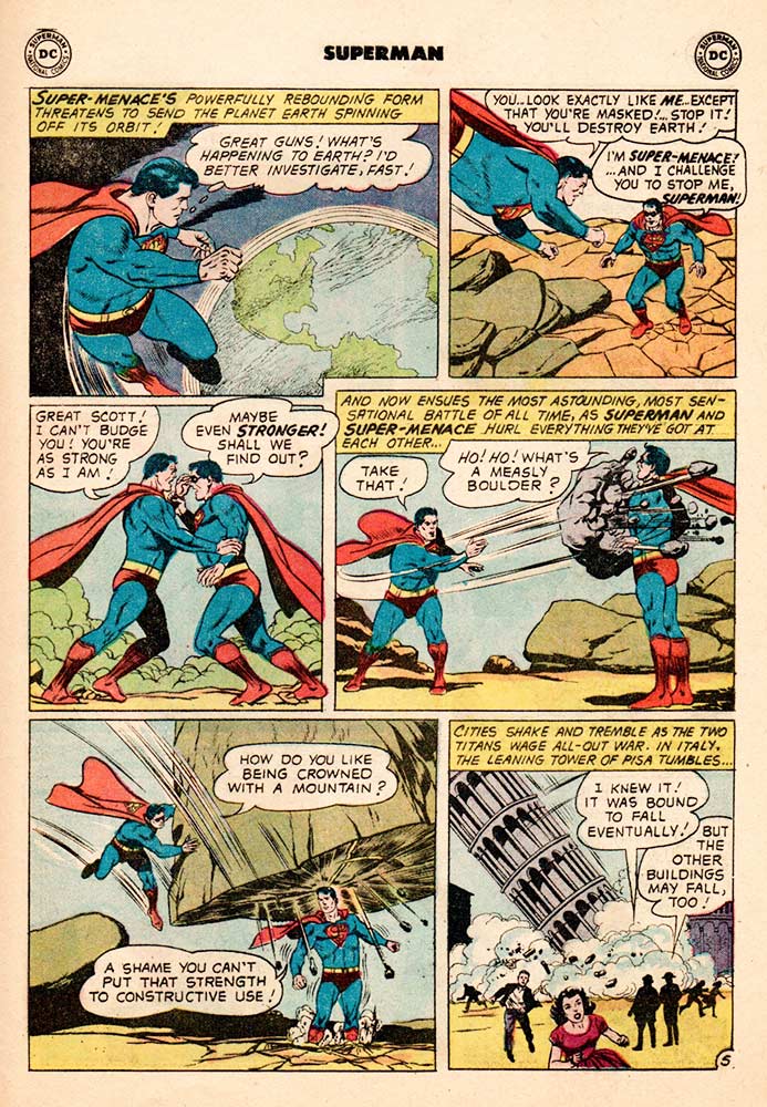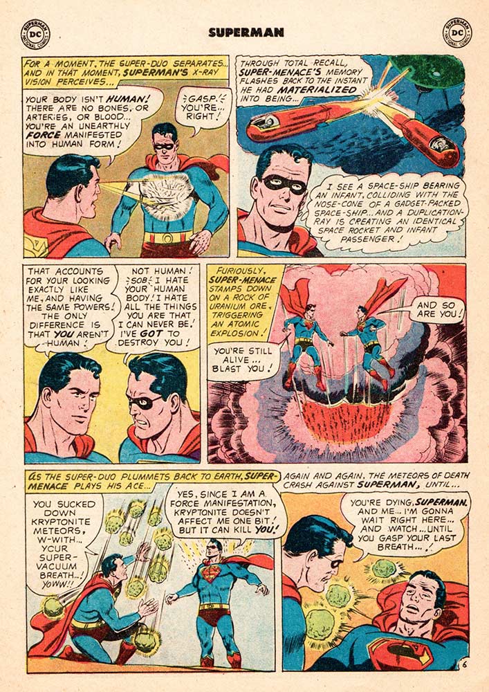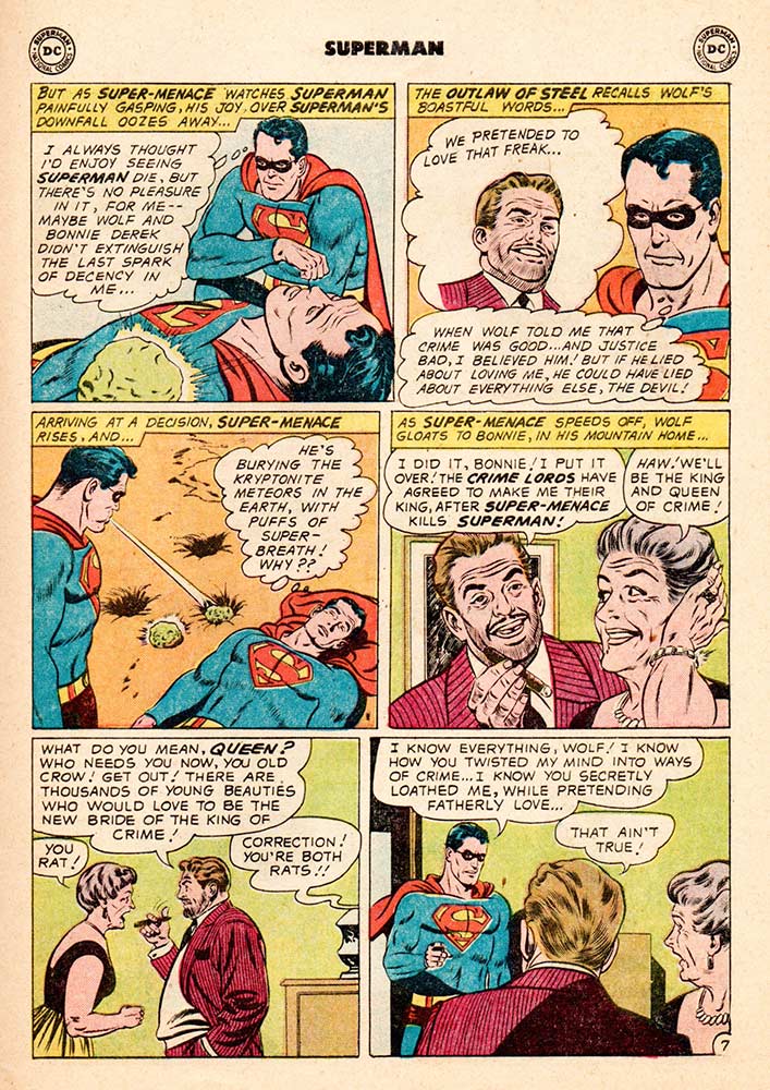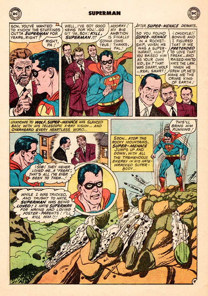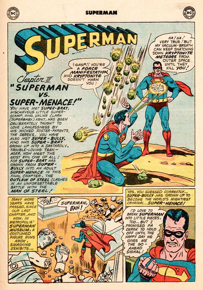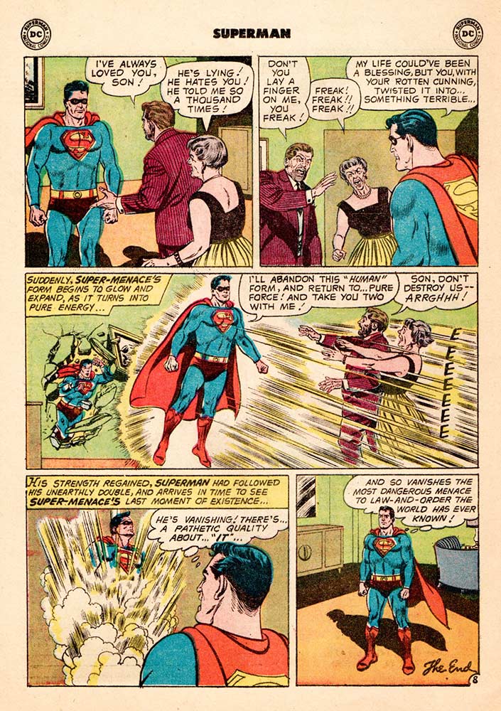 Along the way, Super-Bully realizes he isn’t affected by Kryptonite and—as a fully-grown adult—he uses the rare rock against Superman and gains the upper hand in the final chapter, “Superman vs. Super-Menace.” Pa Wolf introduces his super-powered son to his underworld cohorts and gives him the order to kill Superman. But Super-Menace uses his super-hearing and listens in on his adopted pop and his cronies, learning that Wolf and Bonnie only pretended to “love that freak.” This sends Super-Menace into a bit of a temper tantrum, which gets Superman’s attention as his bad-boy double tries to basically destroy the Earth. In the ensuing battle, Superman finds out that Super-Menace is not like the rest of us: He has no internal organs or bone structure. He’s basically just “an unearthly force manifested in human form.” Super-Menace tries to kill Superman through various means (they both survive an atomic blast), ending up with Kryptonite, but has a last minute conscience attack and goes off to instead kill his adopted parents, abandoning his human form and turning back into pure force, taking the evil gangster and his wife with him. Superman thoughtfully ponders the death of “the most dangerous menace to law-and-order this world has ever known,” hopefully also realizing that he almost got his butt kicked big-time. The End.