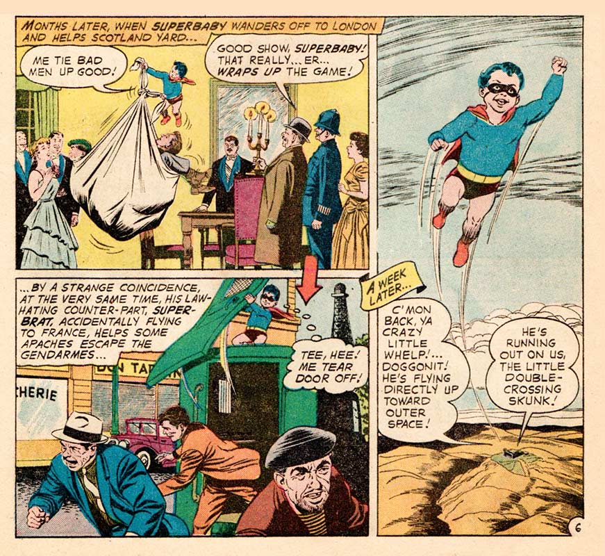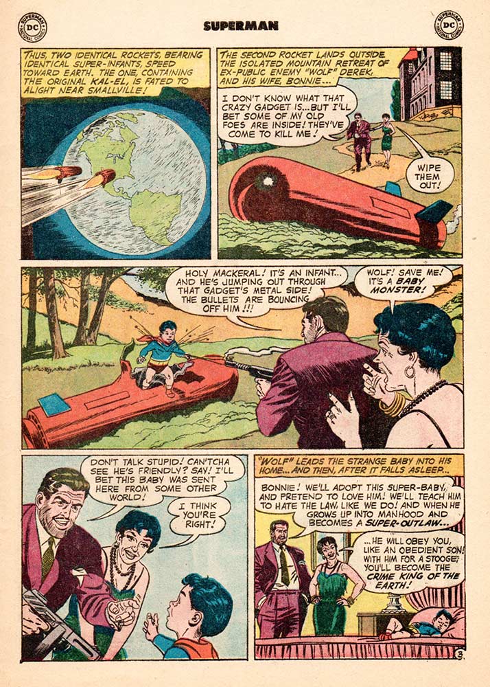 The Super-Brat grows as Superbaby does, into—respectively—Super-Bully (Superboy’s doppelgänger) and Super-Menace (Superman’s). While both Superboy and Superman do good—as their parents, Jonathan and Martha Kent, raised them to do so—Super-Bully and Super-Menace are, quite frankly, super-dicks. Wolf and Bonnie—such warm, loving, and manipulative parents—hate their adopted kid and raise him to commit crimes, like safe-robbing and eliminating their enemies. They keep his presence secret, allowing him to play some tricks on Clark Kent, but it’s Krypto the Super-Dog who literally sniffs out that there’s something rotten in Smallville when Super-Bully runs into him: “You phoney! Nobody tricks Krypto’s super nose!” thinks the Dog of Steel.