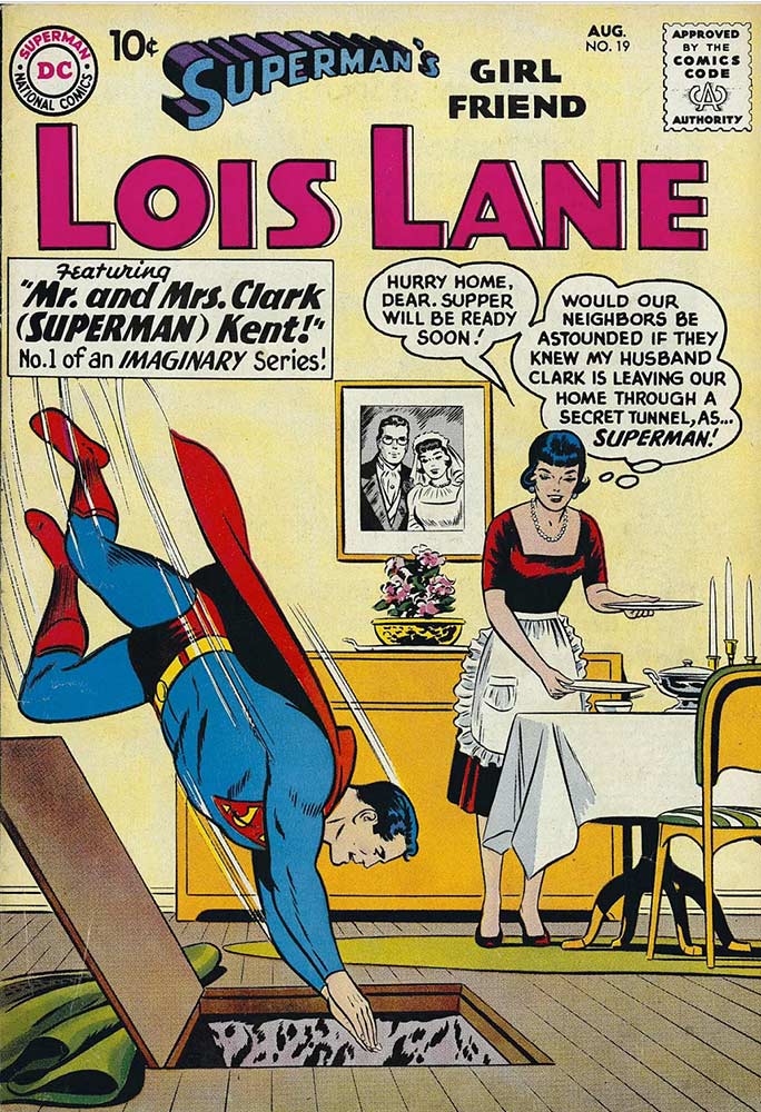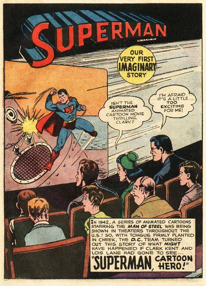 DC’s Superman and Batman titles were big on these so-called imaginary stories in the 1960s. Superman married Lois Lane in the very first story officially called “#1 of an Imaginary Series,” and billed inside as the “First of an Imaginary Series.” That story, “Mr. and Mrs. Clark (Superman) Kent!” appeared in Superman’s Girl Friend Lois Lane #19, cover-dated August 1960. It opened up the floodgates for a whole new realm of storytelling for editor Mort Weisinger and his super writers and artists. DC later retroactively decided that a story from Superman #19 (cover-dated January 1942), titled “Superman: Matinee Idol,” was “Our Very First Imaginary Story,” declaring it so when it was reprinted in the 80-Page Giant issue of Superman #183 (January 1966) and re-titling it “Superman: Cartoon Hero.” Clark Kent and Lois Lane go to the movies and Clark has to divert Lois’s attention while the Max Fleischer Superman cartoon plays on the big screen, so she doesn’t see the parts where he turns into Superman!