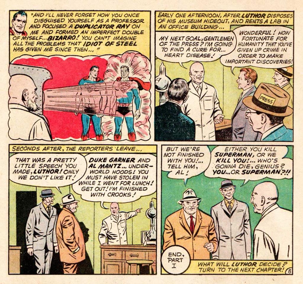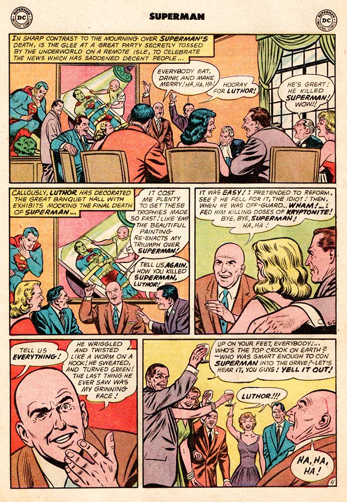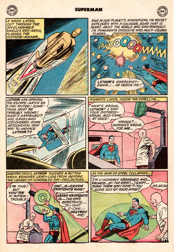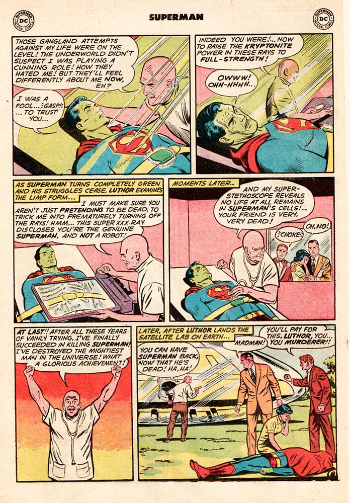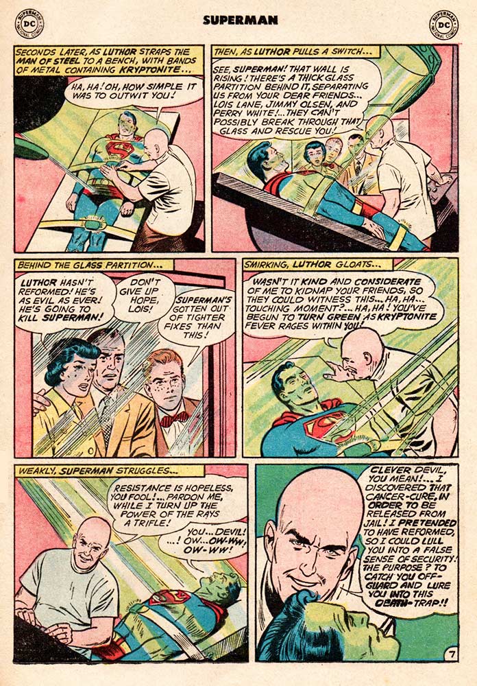 But it’s all been a ruse. Luthor hasn’t changed. He’s been playing the long game and when Superman arrives to see what’s wrong, Luthor traps him with a projector that zaps him with Kryptonite rays. He straps him to a table and makes Superman’s kidnapped friends—Lois Lane, Jimmy Olsen, and Perry White (hmmm … wonder where Clark Kent is during all this)—watch as Luthor slowly kills the Man of Steel, pumping so much Kryptonite into him that the poor (dead) guy turns green … and not in envy.