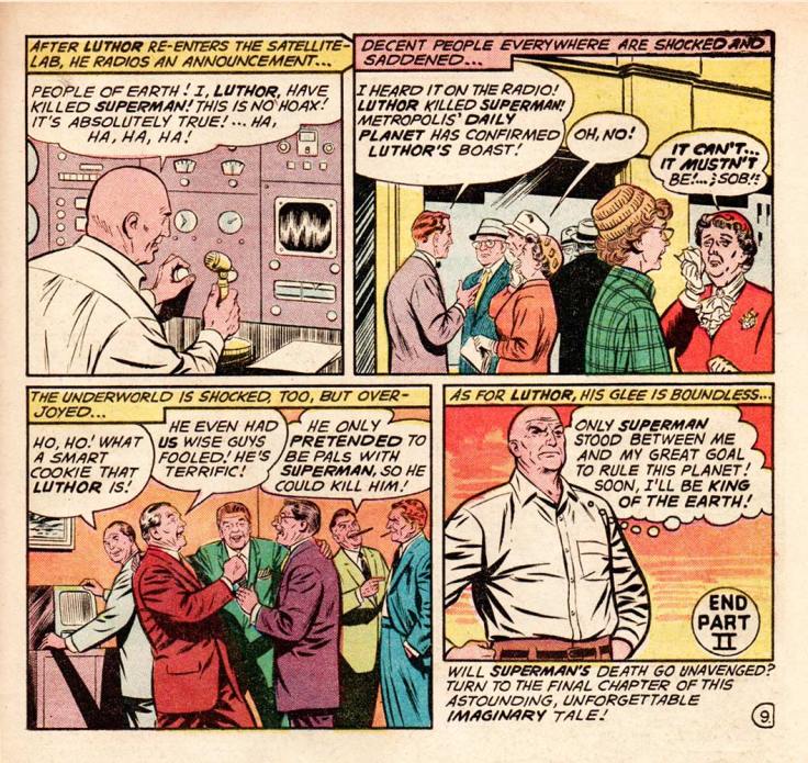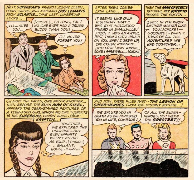 I’ll always remember the 1961 version more fondly, though, because to my six-year-old mind, that imaginary story was more real and visceral, even if it was totally forgotten a few weeks later when Superman #150 came out, and everything was back to normal in Metropolis. I have so much fondness for that pink (PINK! Who paints their space station laboratory PINK?!) cover, with a dead Superman strapped to that examination table, that it makes me go “CHOKE!” and even “SOB!” “Cry your hearts out, folks!” that dick Luthor says on the cover. And some of us did, I suppose. Some of us did.