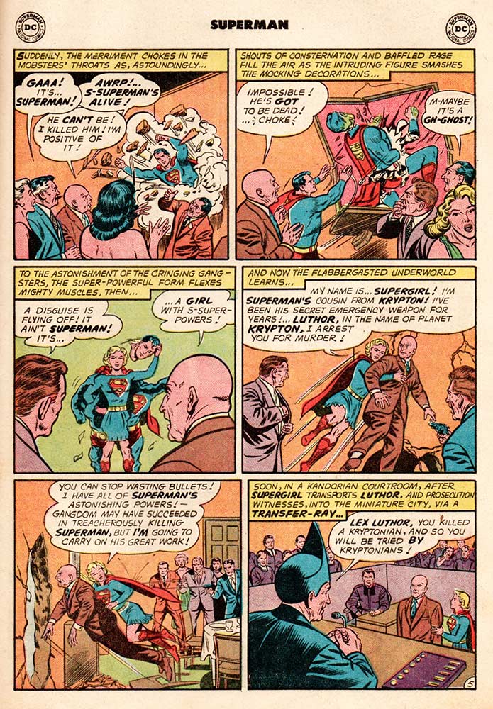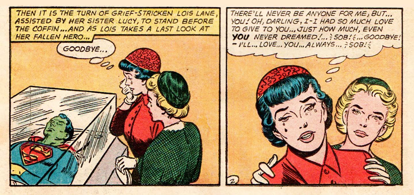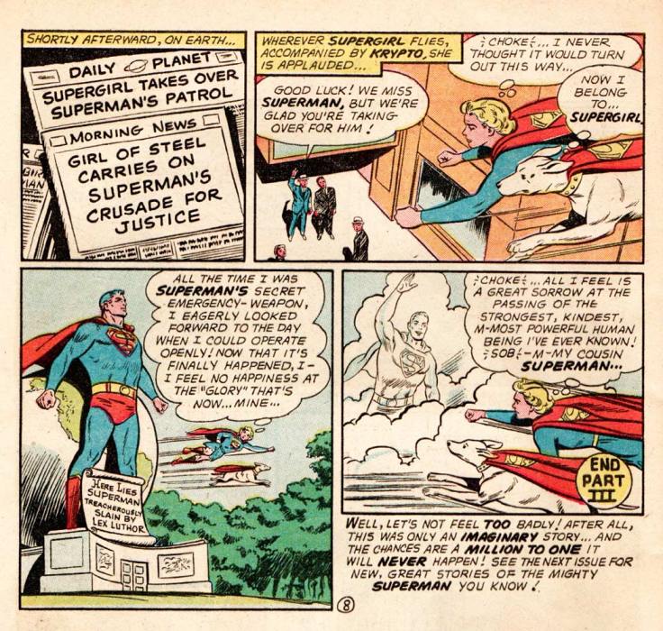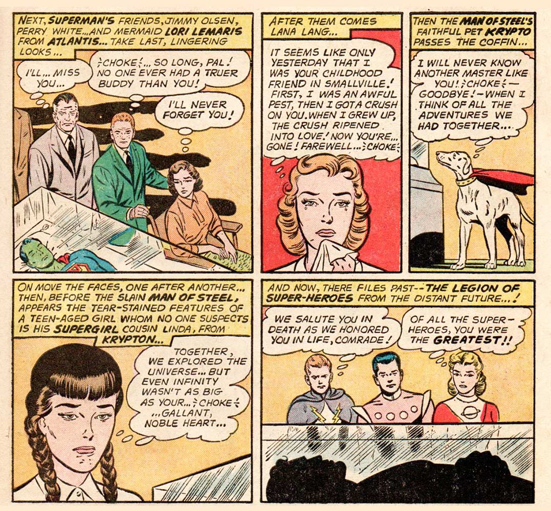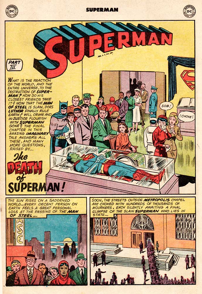 There’s a funeral for Superman in the third chapter of this book-length story, finally titled “The Death of Superman,” where his friends all walk past his green-faced and glass-enclosed body to pay their respects. Even Krypto, the Super-Dog stops by and thinks, “I will never know another master like you! CHOKE—Goodbye.” (“Choke” was DC code for an extreme emotional moment. “SOB” meant crying was involved.) Luthor gathers all his criminal friends together to celebrate (he even dons a spiffy brown suit!), when suddenly Superman bursts through the wall, much to Luthor’s murderous chagrin. Quickly, a costume is ripped off to reveal Kara Zor-El, Supergirl, Superman’s “secret emergency weapon,” who whisks Luthor off to the hoosegow. Luthor is tried in the bottle city of Kandor, the last remaining city of Krypton, where he tries to bargain with the judge and jury, but is ultimately sentenced to the Phantom Zone, a kind of living death (now there’s an oxymoron for you right there), in another dimension. Supergirl and Krypto end the story flying over a giant statue of Superman and having one of those DC extreme emotional moments, we know because she both CHOKEs and SOBs as she says: “CHOKE …All I feel is a great sorrow at the passing of the strongest, kindest, m-most powerful human being I’ve ever known—SOB—my cousin, Superman!” The End, but not before the editor reminds us: “Well, let’s not feel too bad! After all, this was only an imaginary story … and the chances are a million to one it will never happen! See the next issue for new, great stories of the mighty Superman you know!”