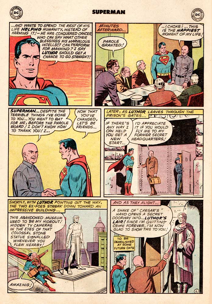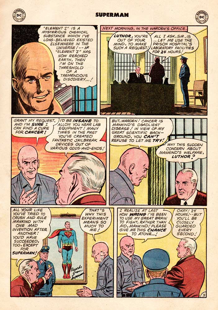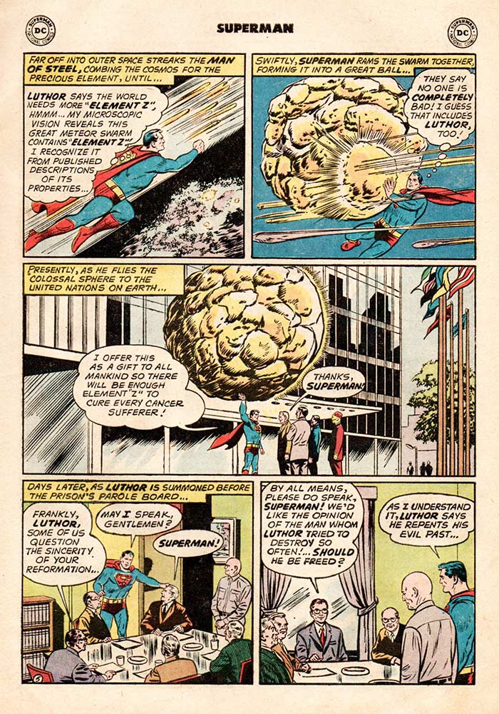 Lex Luthor is doing time in prison when he comes across a rare mineral, Element Z, which just happens to pop up in the exercise yard, in the first chapter of this epic issue, titled “Lex Luthor, Hero!” He persuades the warden to let him have access to a laboratory (“I’d be insane to let you near lab equipment,” quips the warden), so he can use his Element Z to cure cancer. Luthor assures the warden that he’s turning over a new leaf, that he wants to use his “great mind” to aid mankind, not fight it. The warden grants his request and lo and behold, as Jimmy Olsen puts it, “From heel to hero overnight,” when Luthor does, in fact, cure cancer. Superman gathers a whole big pile of Element Z from around the universe and speaks on Luthor’s behalf at a parole hearing. And—believe it or not—the mortal enemies become BFFs.