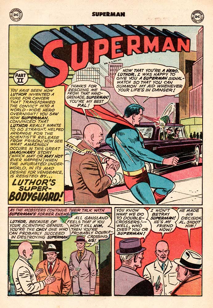 Gangsters try to get Luthor to kill Superman, but the reformed villain turns them in. In the second chapter, titled “Luthor’s Super Bodyguard,” Superman gifts Luthor with a signal watch, just like the one he gave to Jimmy Olsen (poor Jimmy … at least he got to keep his own comic book series). But protecting Luthor quickly becomes a full-time job, so Superman builds him a space station that keeps him safe and sound in outer space … until the day when Luthor uses the emergency signal rocket (which just happens to look like Luthor … talk about branding) to get Superman to come save him.